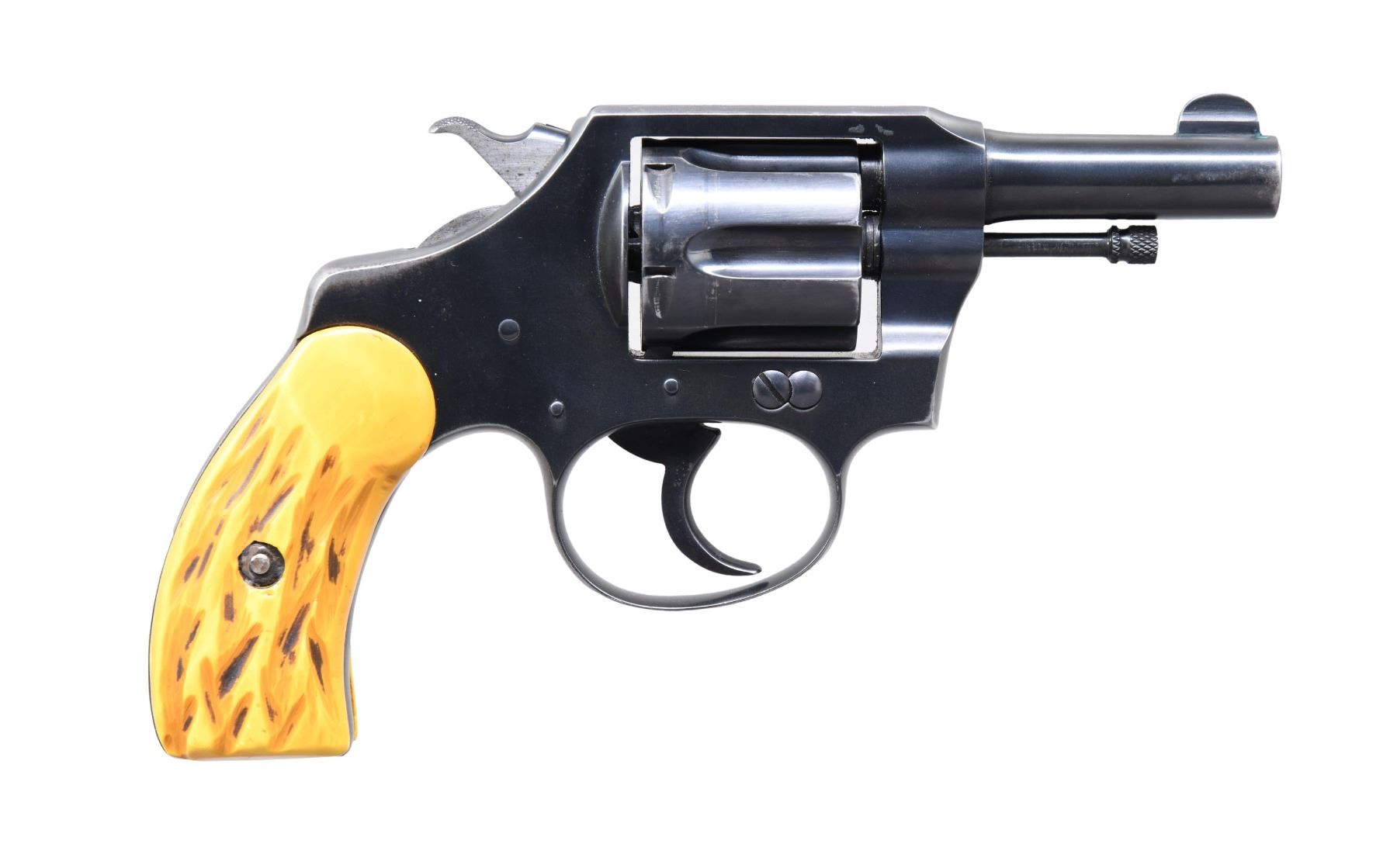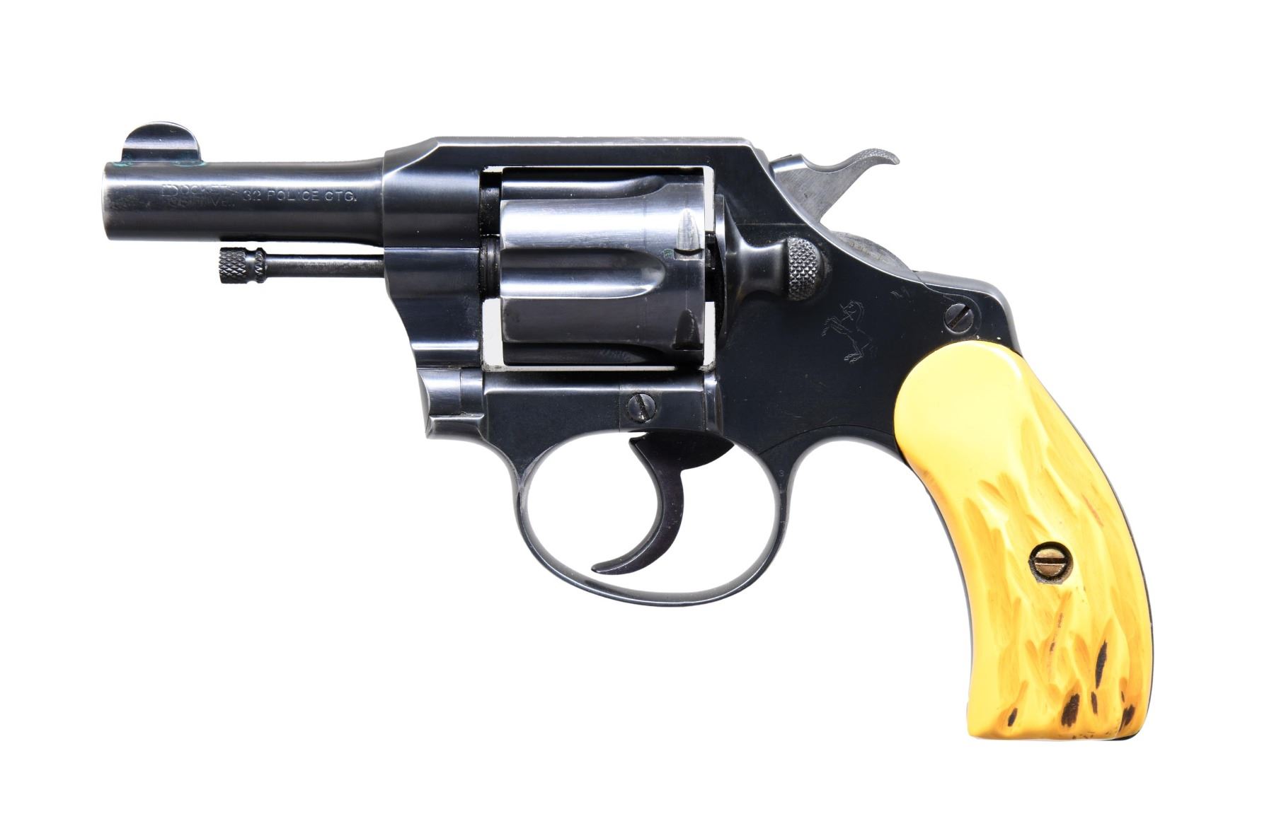 REVOLVER. Cal. 32 Police. S# 154151. Bbl. 2 1/2". Police Positive double action revolver mfg. by Colt in 1919. Left side of the bbl. is marked with the model and cal. designations, with Colt's mfg. and patent information marked across the top. Left side of the frame is marked with the Rampant Colt logo. Metal components exhibit a reapplied blue finish overall. Frame is mounted with 2-piece faux stag grips. Half-moon blade front sight, with frame notched rear sight. Matching numbers are present on the frame and cyl. crane. CONDITION: metal components retain the majority of their reapplied blue finish, exhibiting some areas of light to mild wear and thinning, some scattered superficial handling marks, as well as some areas of light to mild pitting overall. Mirror bore, retaining strong rifling throughout. Grips show some superficial marks from handling and storage, but otherwise remain sturdy and serviceable. (25-583/MLW). CURIO. $500-700.