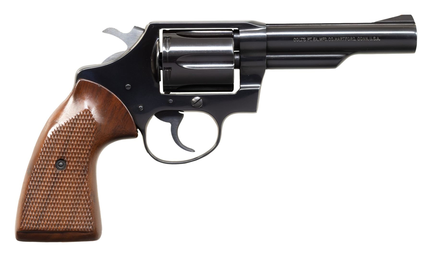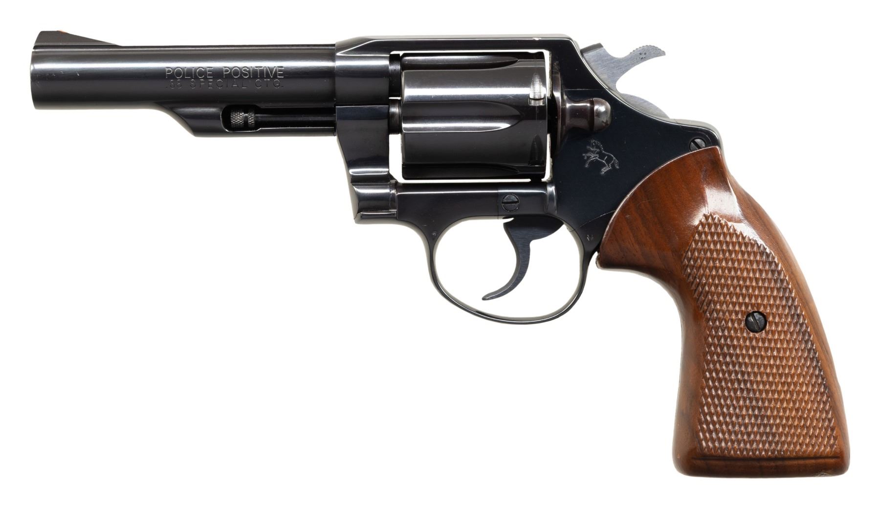 REVOLVER. Cal. 38 Spl. S# 58135M. Bbl. 4 1/16". Police Positive double action revolver mfg. by Colt in 1977. Left side of the bbl. is marked "POLICE POSITIVE/ .38 SPECIAL CTG.", with Colt's single line address marked on the right. Left side of the frame is marked with the Rampant Colt logo. Metal components exhibit a blue finish overall, with the top strap of the bbl. and hammer exhibiting a matte blue finish. Sides of hammer are polished in-the-white. Frame is mounted with 2-piece checkered wood grips. Blade front sight with frame notched rear sight. Matching numbers are present on the frame and cyl. crane. CONDITION: excellent, with metal components retaining bountiful amounts of their original factory blue finish, exhibiting some light superficial handling marks and a few spots of light surface oxidation overall. Mirror bore, retaining well defined rifling throughout. Grips show some superficial handling marks, but otherwise remain very good overall. Bottom of left panel shows a small spot of apparent touch up varnish. (25-5101/MLW). MODERN. $500-800.