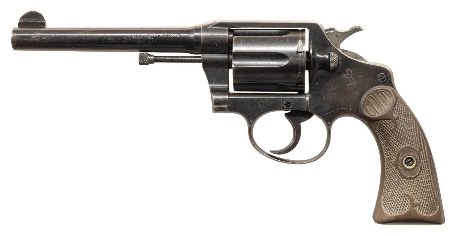 Cal. 38 Spl. S# 264364. Bbl. 5". Round blade front sight. Fixed rear sight. 1922 made Police Positive Special revolver. 6-shot cyl. Blued finish. Checkered brown hard rubber grips with mismatch pencil numbers inside. CONDITION: right grip panel shows a notable chip at bottom rear, grips otherwise show scattered staining, overall checkering wear & handling marks. Metal retains 40% original blue with overall fading, scattered oxidation, light dings, handling marks & edge wear. Action functions properly when hand cycled. Very good bore with strong rifling. (25-6542/MJC). CURIO. $250-450.
