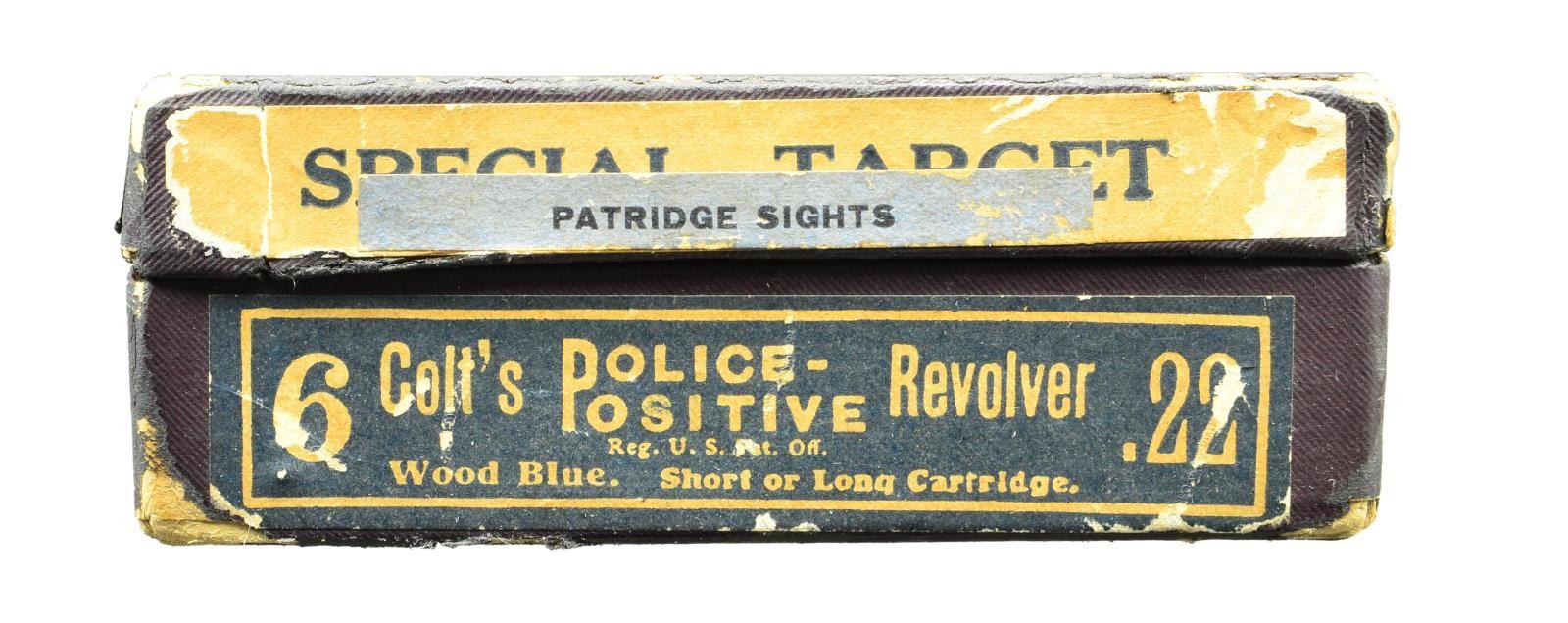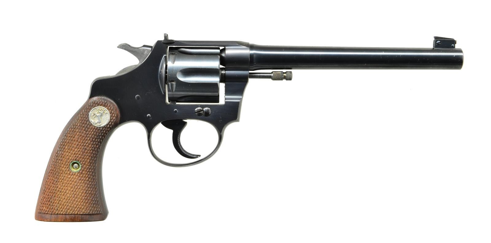 Cal. 22 LR. S# 37344. Bbl. 6" rnd. w/ adj. Patridge front sight & adj. square notch rear sight. Six shot fluted cyl. Blue finish w/ polished sides on hammer. Checkered trigger & checkered backstrap. Two piece square butt walnut grips w/ silver colored rampant colt medallions. Mfg. 1929. UNATTACHED ACCESSORIES: one piece box w/ proper label & S# on bottom. Box contains Colt instructions, Cellar Club pamphlets, cleaning rod & Colt iron screw driver w/ hexagon handle. Box shows light tattering. CONDITION: over 97% original blue showing light edge wear. Very good grips. Sound action & very good bright bore. (22-1102/DS). MODERN. $1,000-1,500.