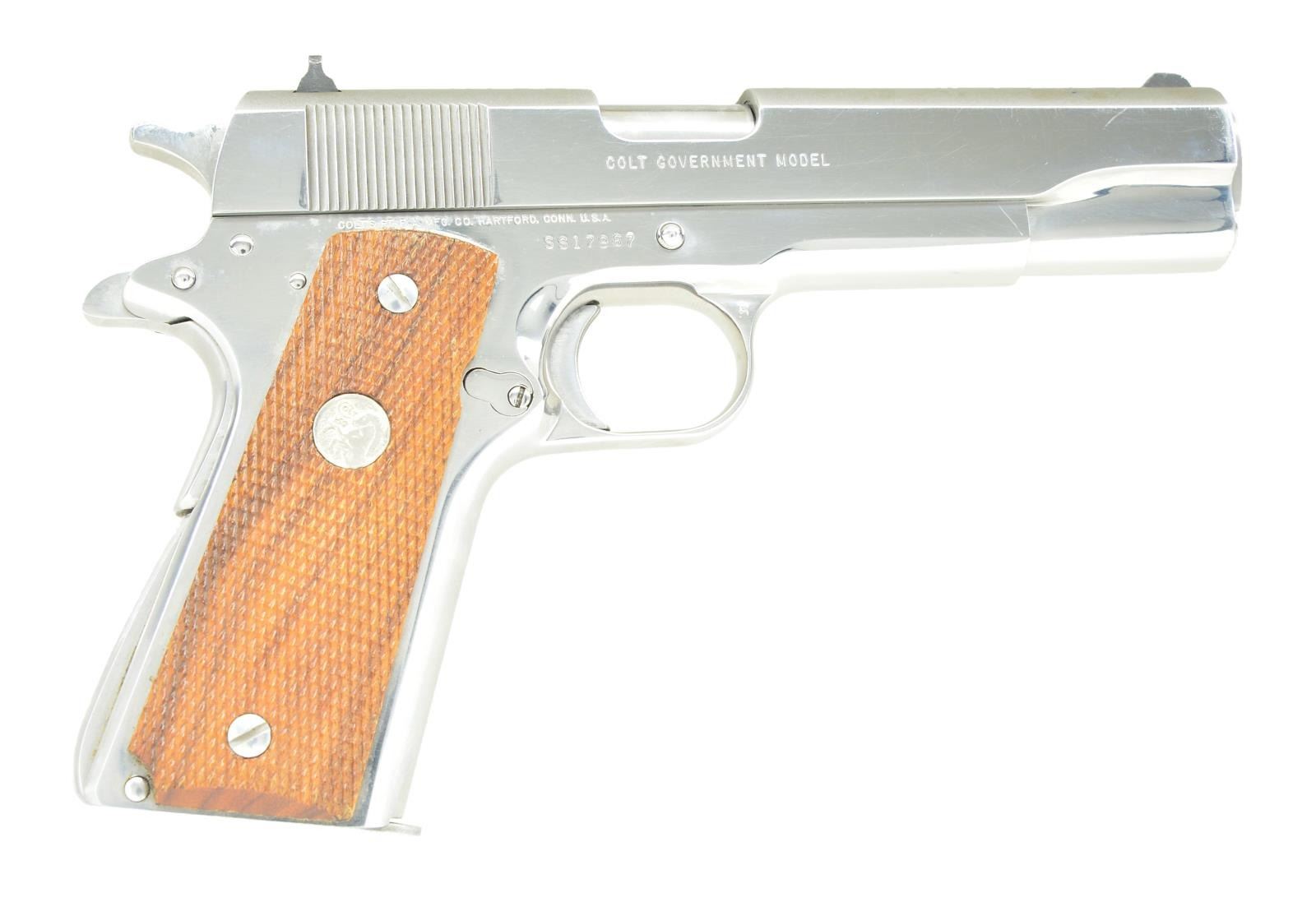 Cal. 45 ACP. S# SS17967. Bbl. 5" Colt marked stainless. Mfg. 1986 (1985-1991) with fully checkered walnut grips having silver Colt medallions. High polish finish with no alterations. Features: matte top of slide, grooved arched mainspring housing, spur hammer and 1911-A1 style grip safety. Blued fixed sight set; angle faced wide front and drift adjustable windage rear. MAGS: near excellent factory stainless 7 rd. CONDITION: very good to near excellent with some very faint light marks (also, faint mark from improper slide stop installation) throughout that might greatly improve with application of quality metal polish. Near excellent grips. Very good to near excellent bright bore with very light fouling in corners of grooves. (22-6367/NW). MODERN. $800-1,200.