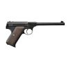 Cal. 22 LR. S# 45679. Bbl. 6 5/8". Mfg. 1925 pistol features adjustable front and rear sights, bottom magazine release and fully checked wooden grips. MAGS: 1-10 rd. factory two tone. CONDITION: metal surfaces retain about 95% original finish on the frame, slide and barrel with some light wear at the muzzle and the front gripstrap is fading to a mostly blue patina and the backstrap is a brown patina. Grips retain strong texture with points flattening. Bore is near excellent, bright and strongly rifled. (22-5350/CW). CURIO. $500-800.