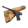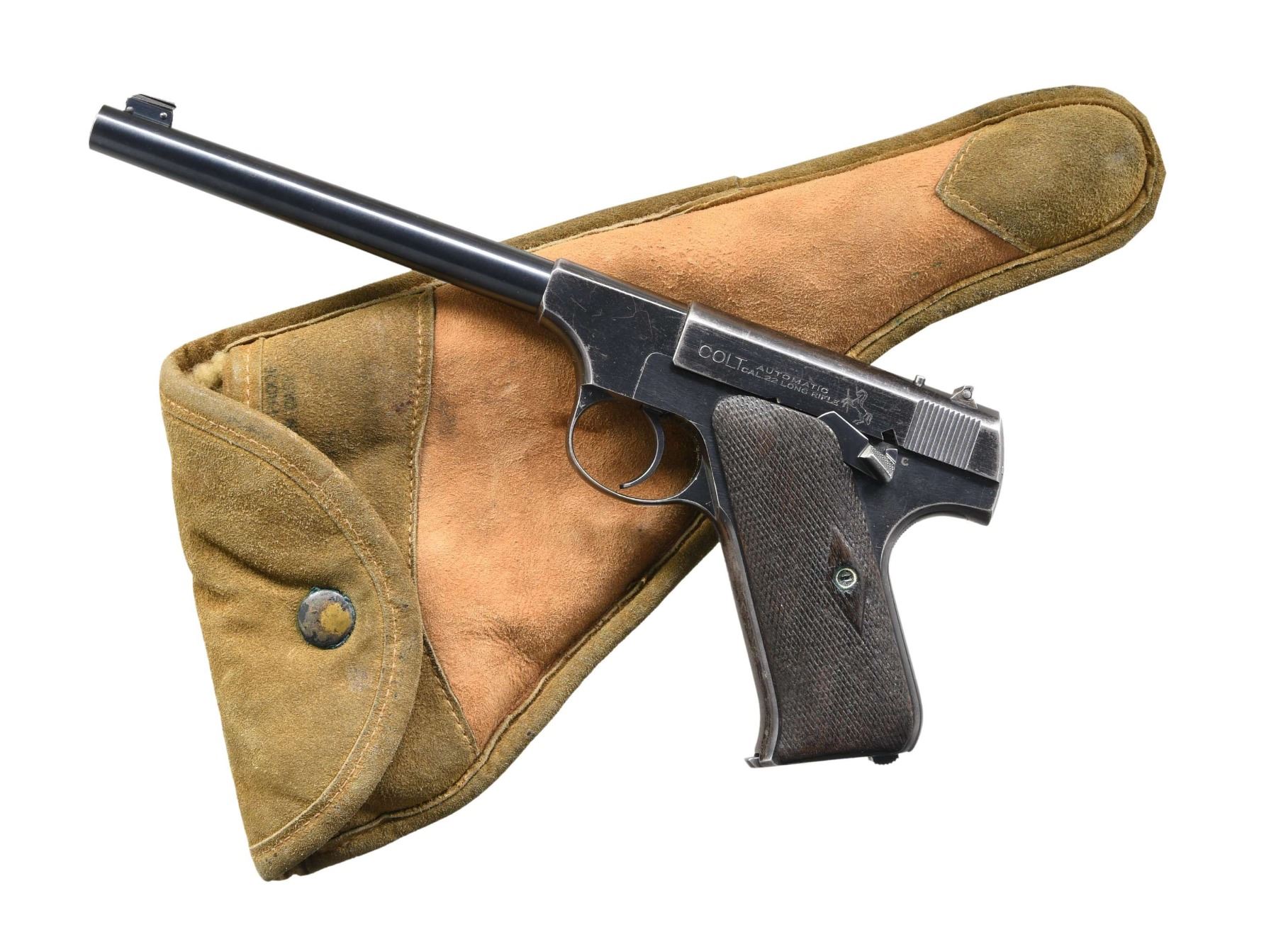 Cal. 22 LR. S# 32072. Bbl. 6 5/8". Pre-Woodsman semi-automatic pistol mfg. by Colt in 1922. Top of the bbl. is marked with Colt's 2-line address and patent information. Left side of the slide is marked "COLT", followed by the cal. designation and the Rampant Colt logo. Metal components exhibit a blue finish overall. Frame is mounted with 2-piece checkered wood grips. Bbl. appears to be a proper period replacement, exhibiting little wear. MAGS: 1 10-rd. UNATTACHED ACCESSORIES: generic soft case. CONDITION: frame and slide exhibit edge wear, with scattered areas of wear, as well as scattered superficial handling marks and spots of light surface oxidation overall. Bbl. is excellent, showing a few minor superficial handling marks. Mirror bore, exhibiting well defined rifling throughout. Grips exhibit smoothing, as well as scattered nicks and marks from handling and storage, but otherwise remain sturdy and serviceable. (24-5493/MLW). CURIO. $500-800.