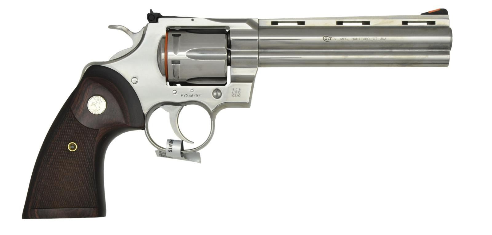 Cal. 357 Magnum. S# PY246757. Bbl. 6" w/ rib & full ejector lug. Red ramp front sight w/ square notch adj. rear sight. Six shot fluted cyl. Stainless steel construction. 2 Piece laminated wood checkered combat grips w/ rampant colt medallions. Recent production. UNATTACHED ACCESSORIES: blue box w/ matching label. Box contains operator's manual, NRA advertisement, Lucas oil advertisement & trigger lock. CONDITION: as new. PROVENANCE: from The Collection of Gun Sport Ltd owned by Jon R. Thomas. (23-2771/DS). MODERN. $1,000-1,500.