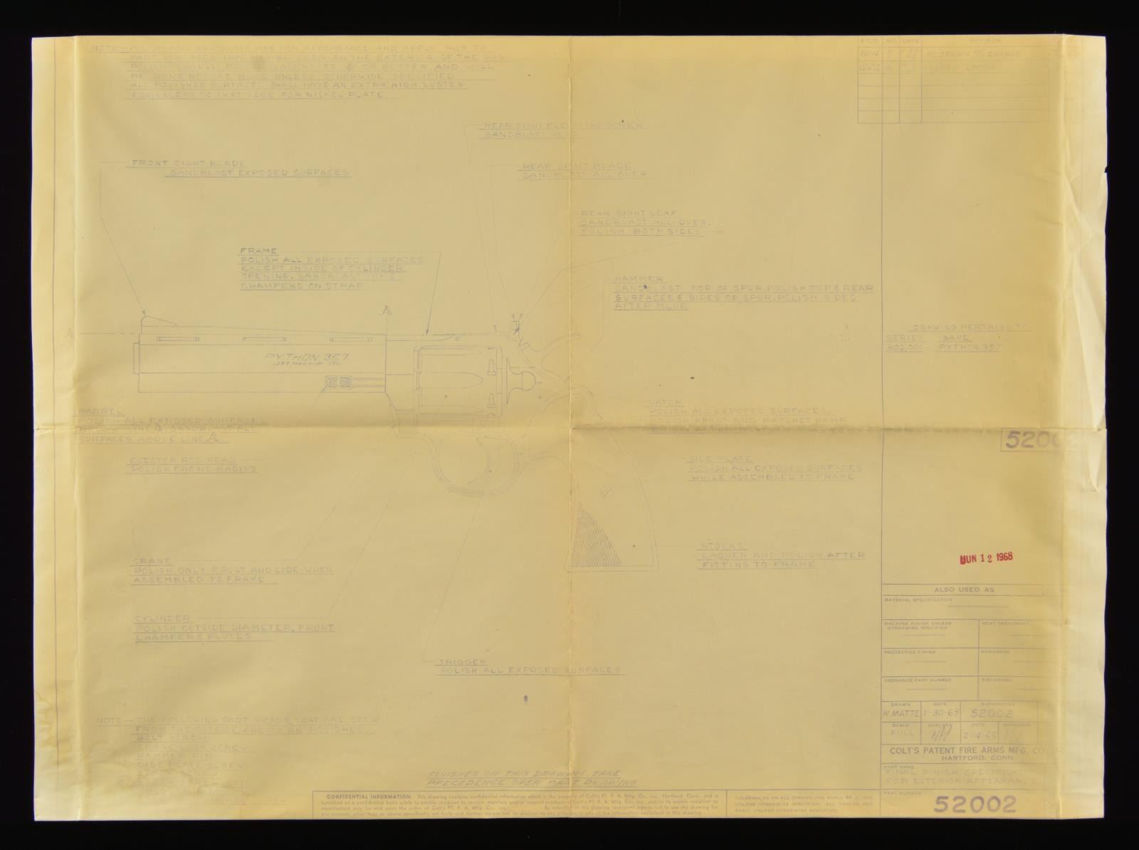 EXTERIOR APPEARANCE" BLUEPRINT. Identified as part #52002, this 22"x16" blueprint depicts the major parts & features of the Python revolver. Main body shows an outline drawing of the revolver w/ arrows leading from descriptions of parts w/ polishing, finishing, fitting & assembly information. Upper left corner has 6-line description of finishing & polishing procedures. Right border shows; blueprint revision dates "1-30-1963" & "12-6-67". Mid section of right border is marked "DRAWING PERTAINS TO / SERIES 802,000 / NAME PYTHON 357". Lower right border states "DRAWN / W. MATTE / 1-30-63" & "CHECKED / H. N / 2-4-63". Red date stamping is June 12, 1968. UNATTACHED ACCESSORIES: blueprint is stored in a protective plexiglass frame w/ cardboard box backing. CONDITION: paper is yellowing & blueprint ink is fading w/ age. Lower left corner shows light water staining. (02-16316/DS). $500-1,000.