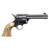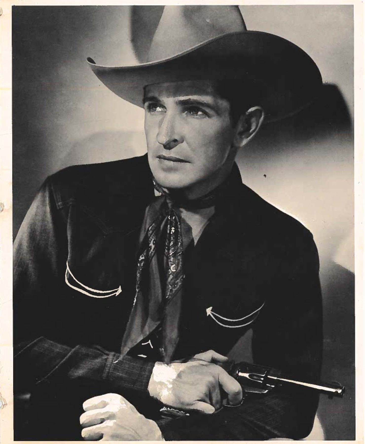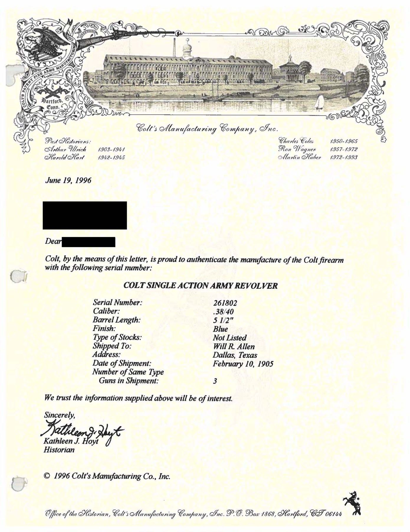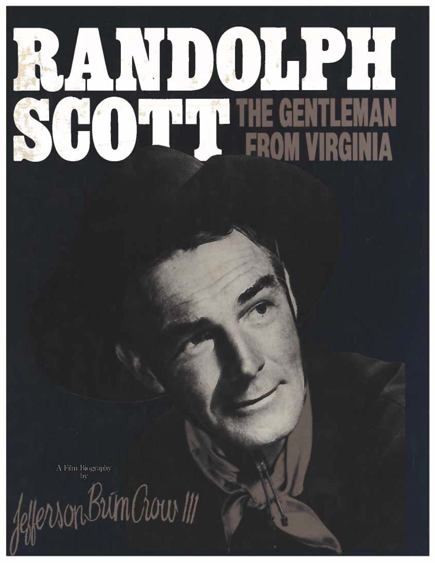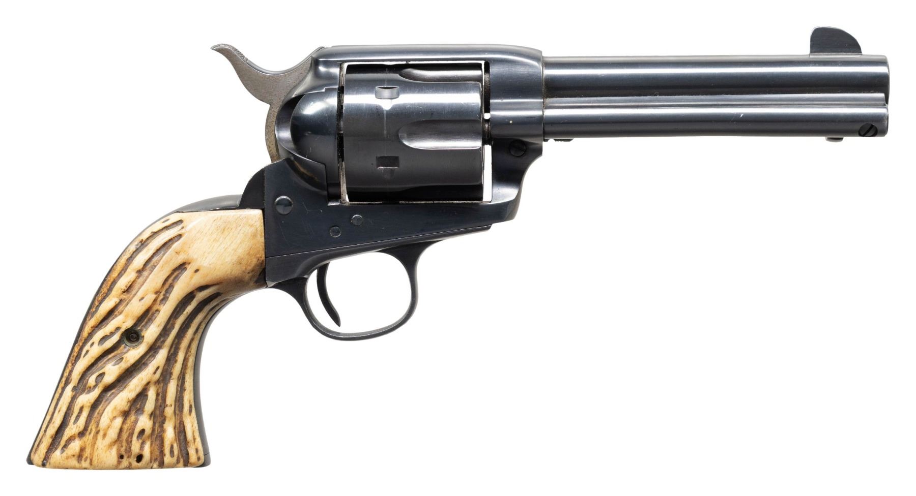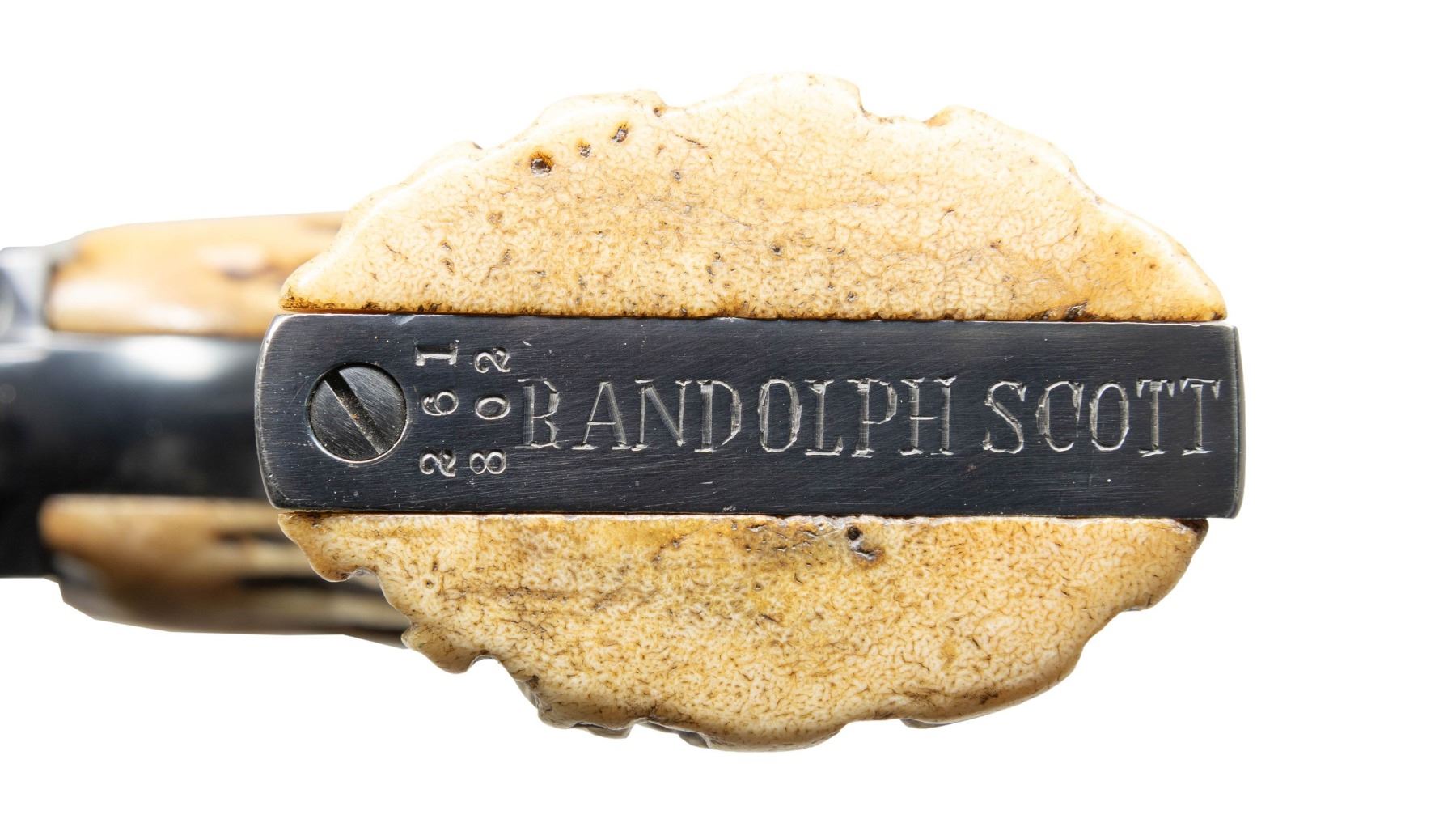 REVOLVER. Cal. 45 Colt. S# 261802. Bbl. 4 3/4". 6-shot fluted cyl. Custom 2-piece stag grips. Butt is engraved "RANDOLPH SCOTT".George Randolph Scott (January 23, 1898 – March 2, 1987) was an American film actor, whose Hollywood career spanned from 1928 to 1962. Bottom of frame through S# has a hand stamped initial "S". UNATTACHED ACCESSORIES: Colt factory letter stating: "Serial Number: 261802/ Caliber: .38/40/ Barrel Length: 5 1/2". Finish: Blue/ Type of Stocks: Not Listed/ Shipped To: Will R. Allen/ Address: Dallas, Texas/ Date of Shipment: February 10, 1905/ Number of Same Type Guns in Shipment: 3". Also includes a copy of the book "Randolph Scott: A Film Biography" by Jefferson Brim Crow III, along with scans, portraits, a letter, and a movie poster. CONDITION: 98% reblued finish showing light muzzle wear and cyl. dragline. Bbl. markings are weakened. Polished hammer sides are showing a mild tarnish. Good grips. Sound action. Lightly pitted bore retains intact rifling. PROVENANCE: The Esteemed Norm Greenberg Collection. (25-4190/DS). CURIO. $2,500-3,500.
