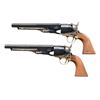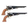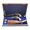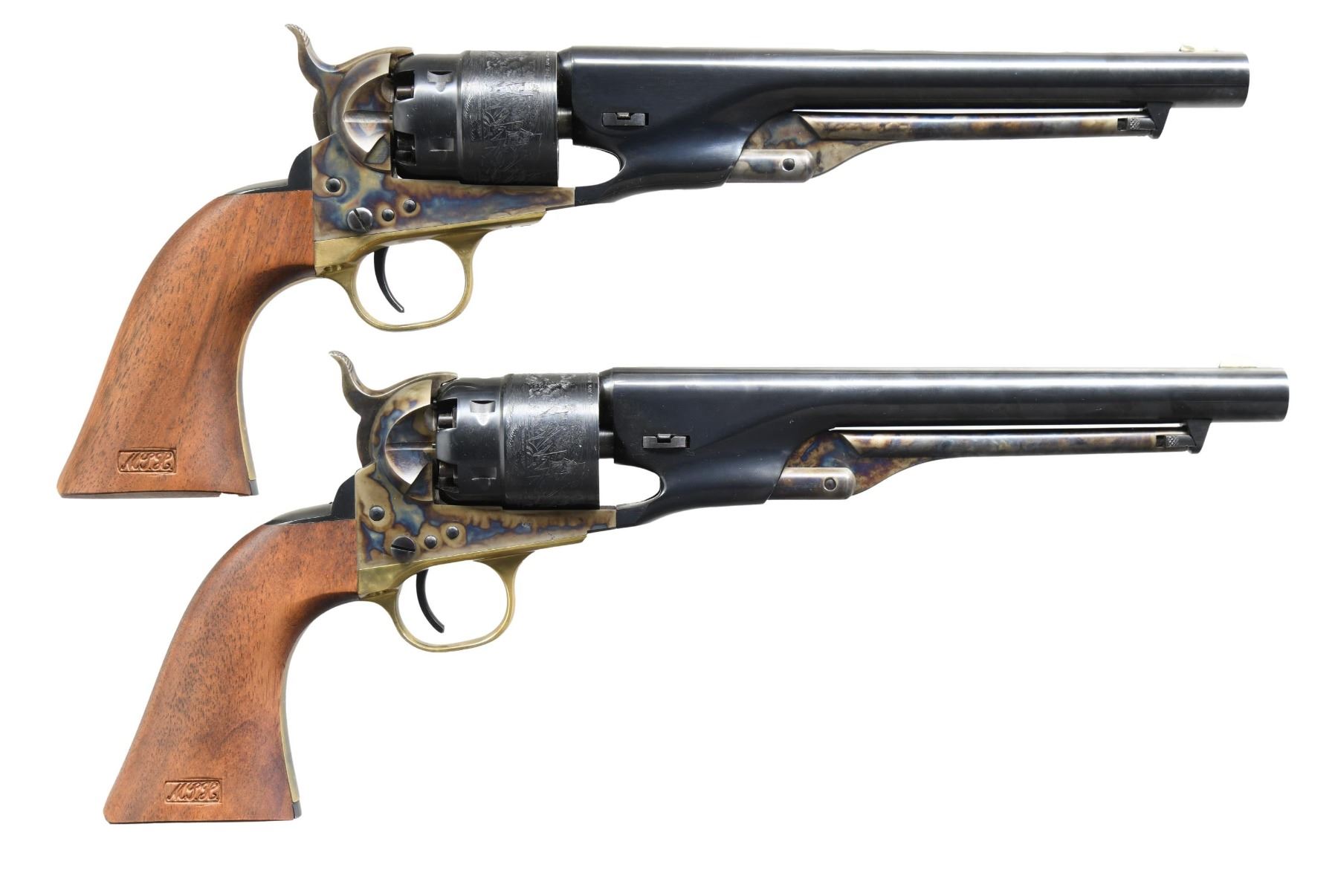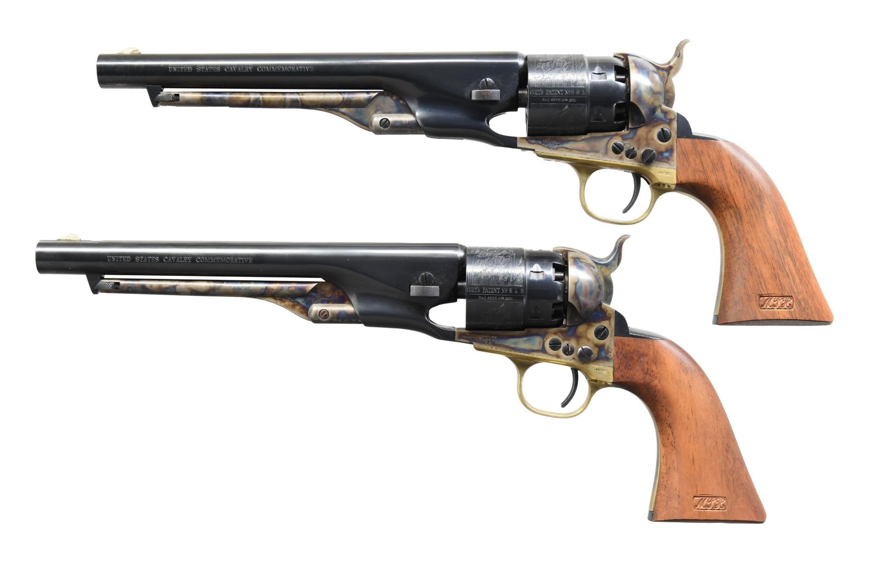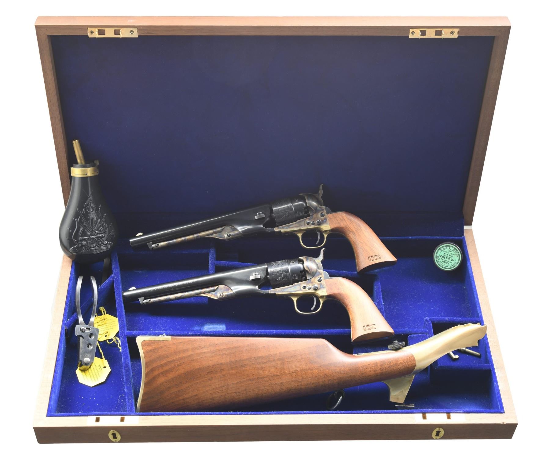 COMMEMORATIVE CASED PAIR REVOLVERS. Cal. 44. Bbls. 8" round w/ blade sights. 6 shot round rebated cyls. w/ naval engagement scene roll engraving. Blue & case colored finish w/ brass trigger guards. Actions have provisions for shoulder stock attachment. One piece walnut grips have cartouche on both panels. Total of 2,945 sets mfg. 1977-1980. UNATTACHED ACCESORIES: wood 2 gun display case w/ oval commemorative plaque on lid. Blue velour fitted interior. Case contains 1 matching number (US1751) shoulder stock, powder flask, 2 cavity mold, cap tin & case key. GUN 1. S#. US1751. CONDITION: as new, appears unfired. GUN 2. S#. 1751US. CONDTION: as new, appears unfired. (01-25870 & 01-25871/DS). BOTH ANTIQUES. $1500-2500.