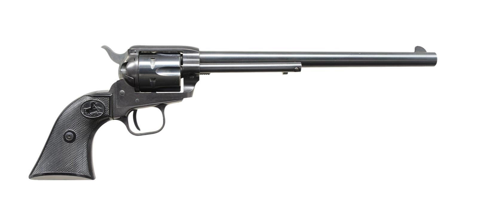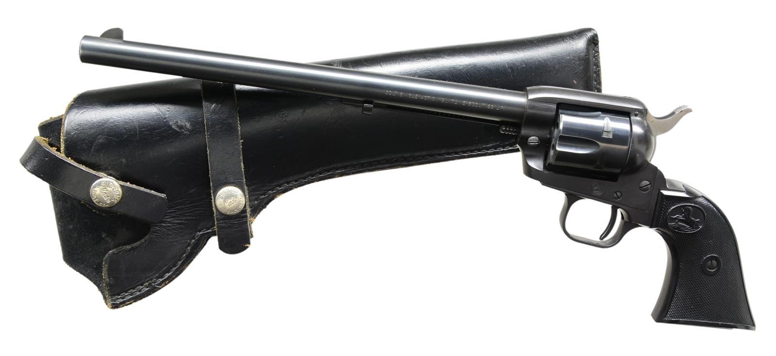 Cal. 22 LR. S# 70370F. Bbl. 9 1/2". Factory blued metal finish w/ black plastic grips. Fixed blade front sight w/ rear notch. Checkered hammer spur. 6 Shot fluted cyl. Left side of bbl. marked "COLT SINGLE ACTION BUNTLINE SCOUT 22 LR". UNATTACHED ACCESSORIES: Bucheimer B44 leather holster. CONDITION: all outward appearances indicate very little use. Very faint cyl. drag line. Light staining on sides of hammer. Bright bore w/ strong rifling (21-3513/JZ). CURIO. $400-600.