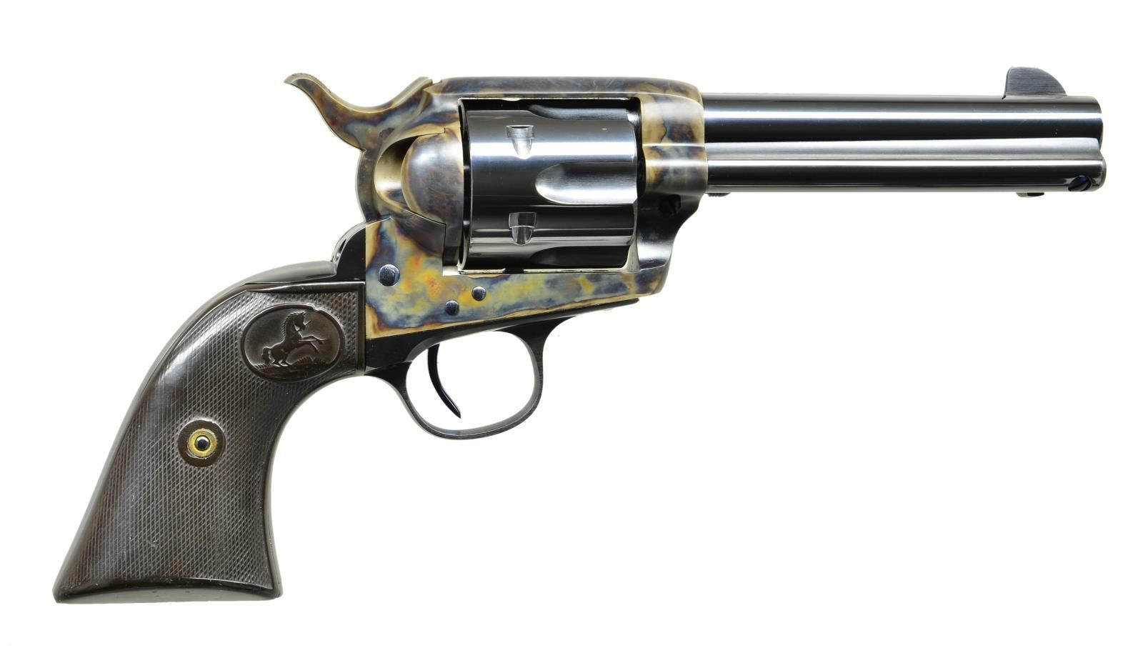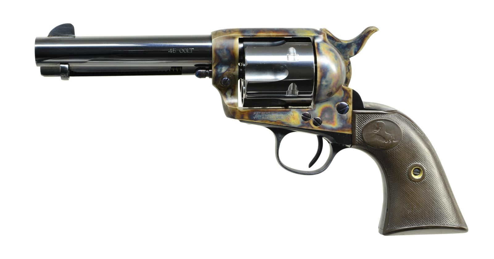 RESTORATION. Cal. 45 Colt. S# 296214 (1907). Consignor states the revolver was restored by Turnbull Restorations of New York in the early 1980's before records were archived. Distinct vivid case colored & blued revolver w/ 4 3/4" bbl., open sights, 6 shot cyl. & original appearing 2 piece brown Rampant colt hard rubber grips. CONDITION: original grips are good w/ worn appearance & light handling marks; balance of revolver near excellent w/ faint cyl. turn line. Near excellent bore. (22-1810/MD). CURIO. $2,000-3,000.