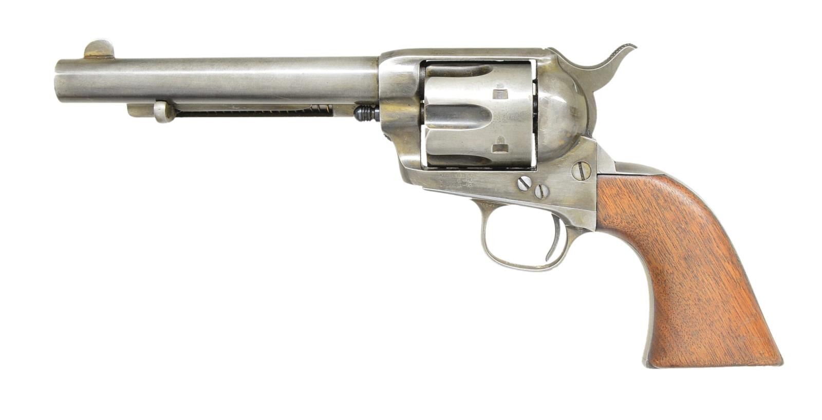 Cal. 45 Colt. S# 102948. Bbl. shortened to 5 5/8" w/ reattached blade front sight. 6 Shot fluted cyl. Left side of frame has 3 line patent marking. Frame, trigger guard & backstrap have matching S#'s. Bbl. has non matching number "3855". Unnumbered cyl. marked "L" & "1" on face. 1 Piece walnut grips. 1884 Mfg. CONDITION: cleaned metal has light gray color from touch up finish. Refinished grips are heavily sanded & undersized w/ chips at toe. Pitted bore has heavily worn rifling. (01-19882/DS). ANTIQUE. $1,200-1,800.