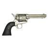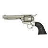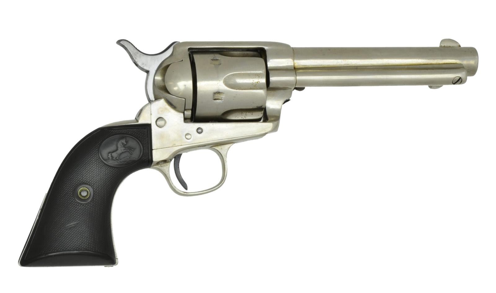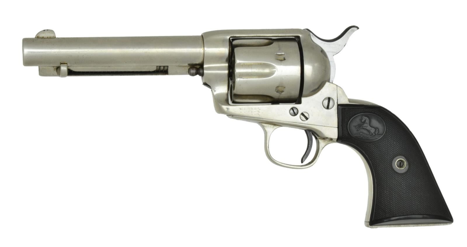 Cal. 44-40. S# 81057. Bbl. shortened to 5 1/16" w/ attached front sight. 6 Shot fluted cyl. Black powder frame, trigger guard & grip strap have matching S#'s. Replacement cyl pin. Frame is drilled out & fitted w/ oversized cyl. pin retaining screw. Replacement mainspring & mainspring screw. Replacement checkered hard rubber rampant Colt grips. 1882 Mfg. CONDITION: metal is heavily polished w/ weak & partially removed markings retaining 90% renickeled finish over spots of remaining pitting. Replacement grips have poor fit to frame. Bore is lightly pitted retaining largely intact heavily worn rifling. (01-19883/DS). ANTIQUE. $700-1,000.