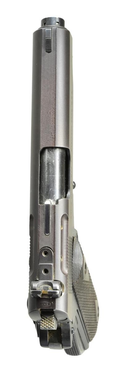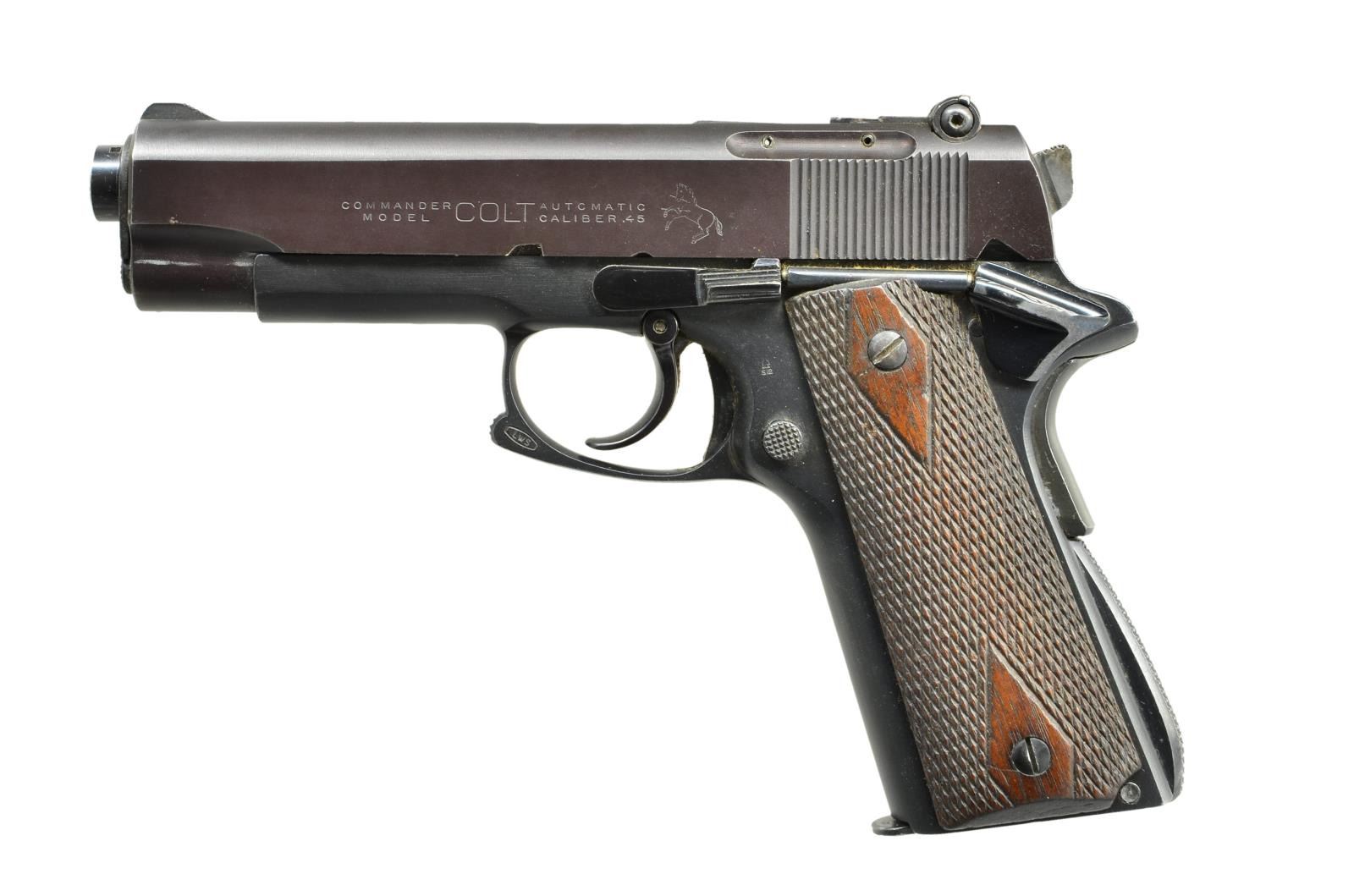 Cal. 45 ACP. S# 419923. Bbl. 4 1/2"; shortened & unmarked regular extending beyond slide w/ 2 small ports at top; normal Officer's Colt bbl. length is 3 1/2". 1918 Colt 1911 still retaining Eagle S12 poof (no other marks); S# relocated to bottom of dust cover. Hooked trigger guard w/ LWS (also at top rear of slide) on left side plus grooved hook. Original double diamond checkered walnut grips. Late production grooved slide lock & thumb safety. Military checkered arched mainspring housing w/out lanyard loop plus grip safety tang shortened to match frame profile (in the white at top). Hallmark DA conversion that received its impetus from P.38 design. Ludwig Seecamp saw advantages of DA autos while fighting for Germany on Eastern front in WW-II. He claimed his DA P.38 saved his life w/ its DA functioning. During 70's to early 80's he produced approx. 2,000 modified pistols after working as designer for Mossberg. Colt Commander slide has flattened top w/ grooves like Colt Gold Cup, serrated ramp front sight, simple adjustable rear sight having white below notch, loaded chamber indicator & decorative lightning flutes above cocking grooves. Regular hammer restyled w/ section added to maintain inertial energy having checkered top. MAGS: 1 good General Shaver 7 rd. blued military. CONDITION: blued bbl. has function wear on exterior as does front of slide. Very good grips w/ faint hand wear. Plum hue to slide; refinished except for small parts w/ very good to excellent appearance. Very good bore. (22-1998/NW). MODERN. $1,500-2,500.