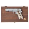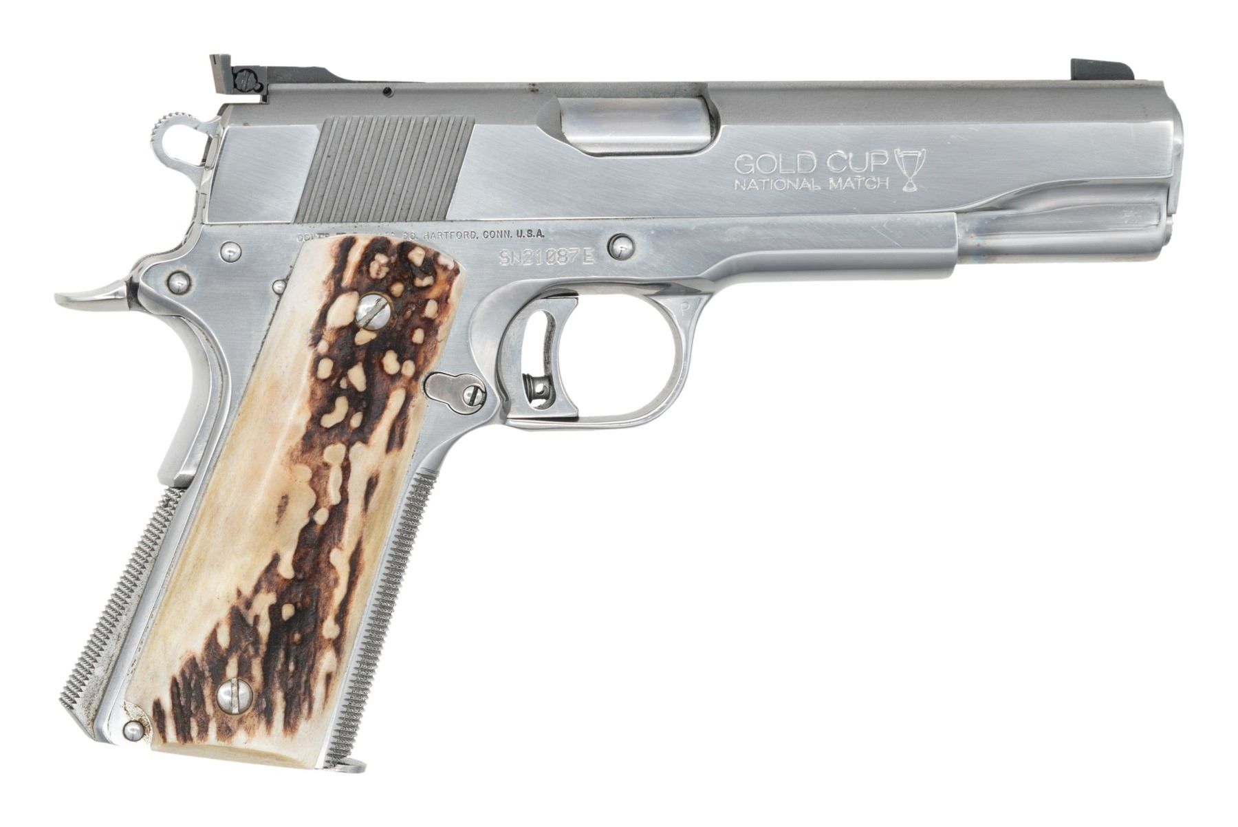 AUTO PISTOL. Cal. 45 ACP. S# SN21087E. Mfg. 1995. Nickel finished pistol with 5" National Match barrel. Grooved rib has Patridge blade front sight & Elliason adj. rear sight. Slide has flared ejection port. Replacement raised checkered mainspring housing; front strap has additional checkering. Replacement large stag grips. MAGS: 1 Wilson Combat 8 rd. UNATTACHED ACCESORIES: Colt presentation case with blue velour interior; shadow-line fitted interior does not match this pistol. Lid has large crack, balance is very good with light wear. CONDITION: very good metal finish with light handling wear. Very good grips. Very good rifling with light residue forward of chamber. (25-4688/MD). MODERN. $800-1,200.