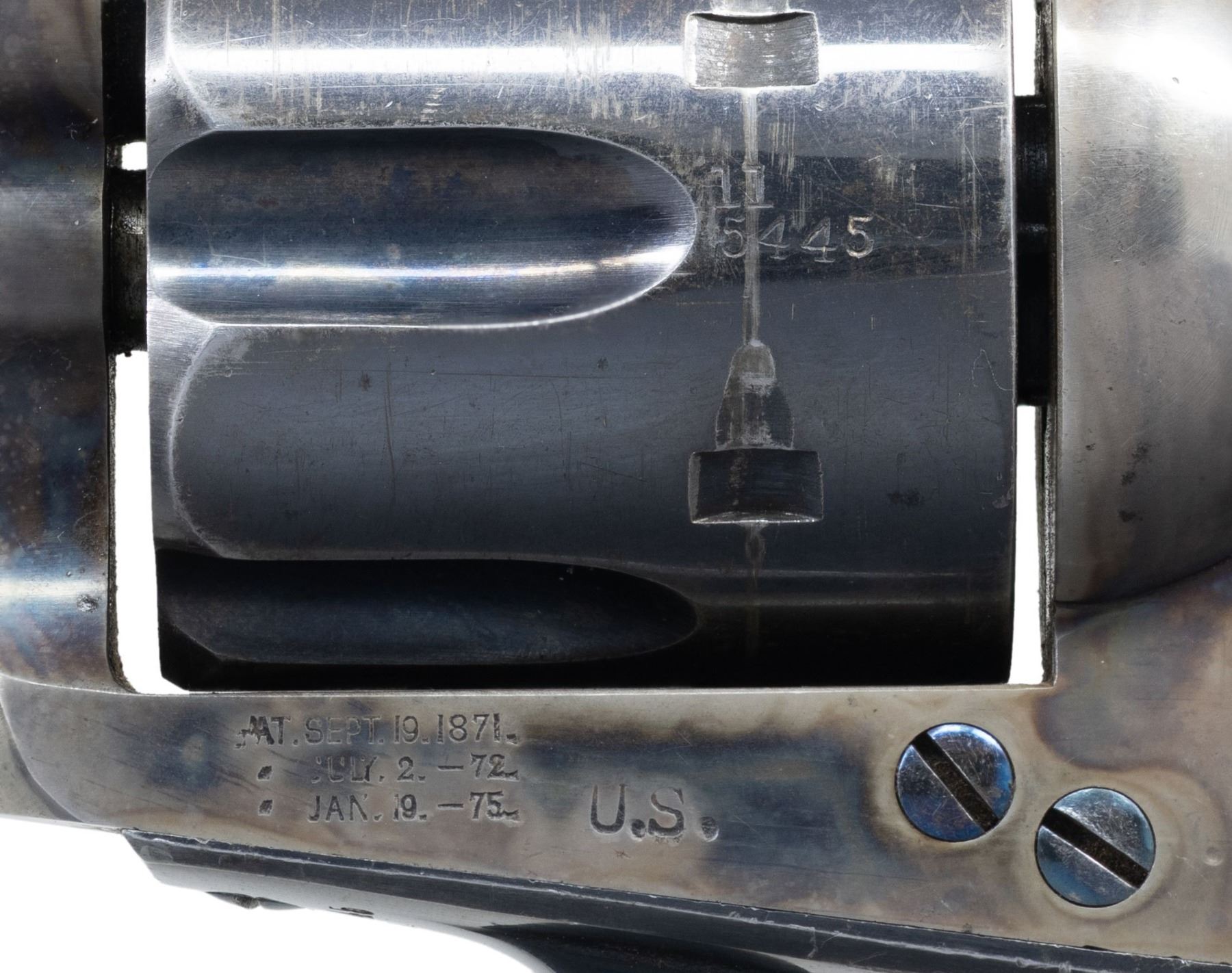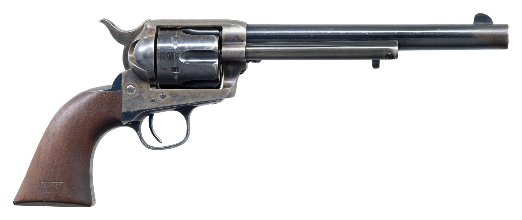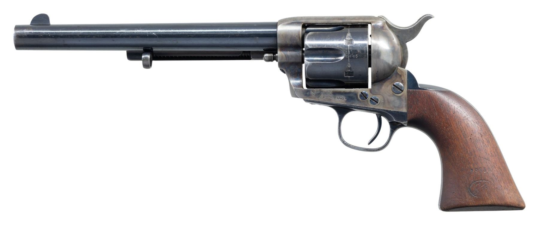 MILITIA REISSUE REVOLVER. Cal. 45 Colt. S# 115445. Bbl. 7 1/2" with standard blade front sight. 6-shot fluted cyl. Blue and case colored finish. Left side of frame is stamped "U.S.". Bbl., frame, grip straps, and cyl. have matching numbers. Cyl. is stamped "11" above S# "5445", as applied during the Colt factory refurbishing. Trigger guard and grip strap have inspector initial "G" beneath the S#. Bottom of bbl. is marked "P" forward of "D.F.C." inspector proof. 1-piece walnut grip. Right panel has a "D.F.C." cartouche, butt is marked "D.F.C.". Left panel has "1885 date over a partially visible "FH" Frank Heath cartouche. This revolver is listed by number on page 79 of the book "Colt Cavalry & Artillery Revolvers, a continuing study" by John A. Kopec and H. Sterling Fenn as one of the 126 identifiable New York Militia revolvers inspected by Frank Heath. UNATTACHED ACCESORIES: Dave Lanara letter stating the following: "This revolver was initially finished, inspected and accepted by the Colt factory in 1885 and probably issued to troops during the Apache wars. While in subsequent storage, it was recalled by the government for refurbishing in 1895. It was the part of the 800 refurbished cavalry revolvers that were issued to the New York Militia. An effort was made to maintain matching cylinder and barrel by adding the first two digits of the serial number, 11, to the already present last 4 digits on the cyl. & bbl". CONDITION: very good as factory refinished. Bbl. and grip straps retain over 70% blue showing light carry wear with scattered small marks and scratches. Frame retains 70% light and fading case colors. Grips have weakened markings. Sound action. Bore retains sound rifling showing scattered small spots of pitting. (01-27975/DS). ANTIQUE. $11,000-14,000.
