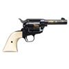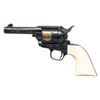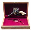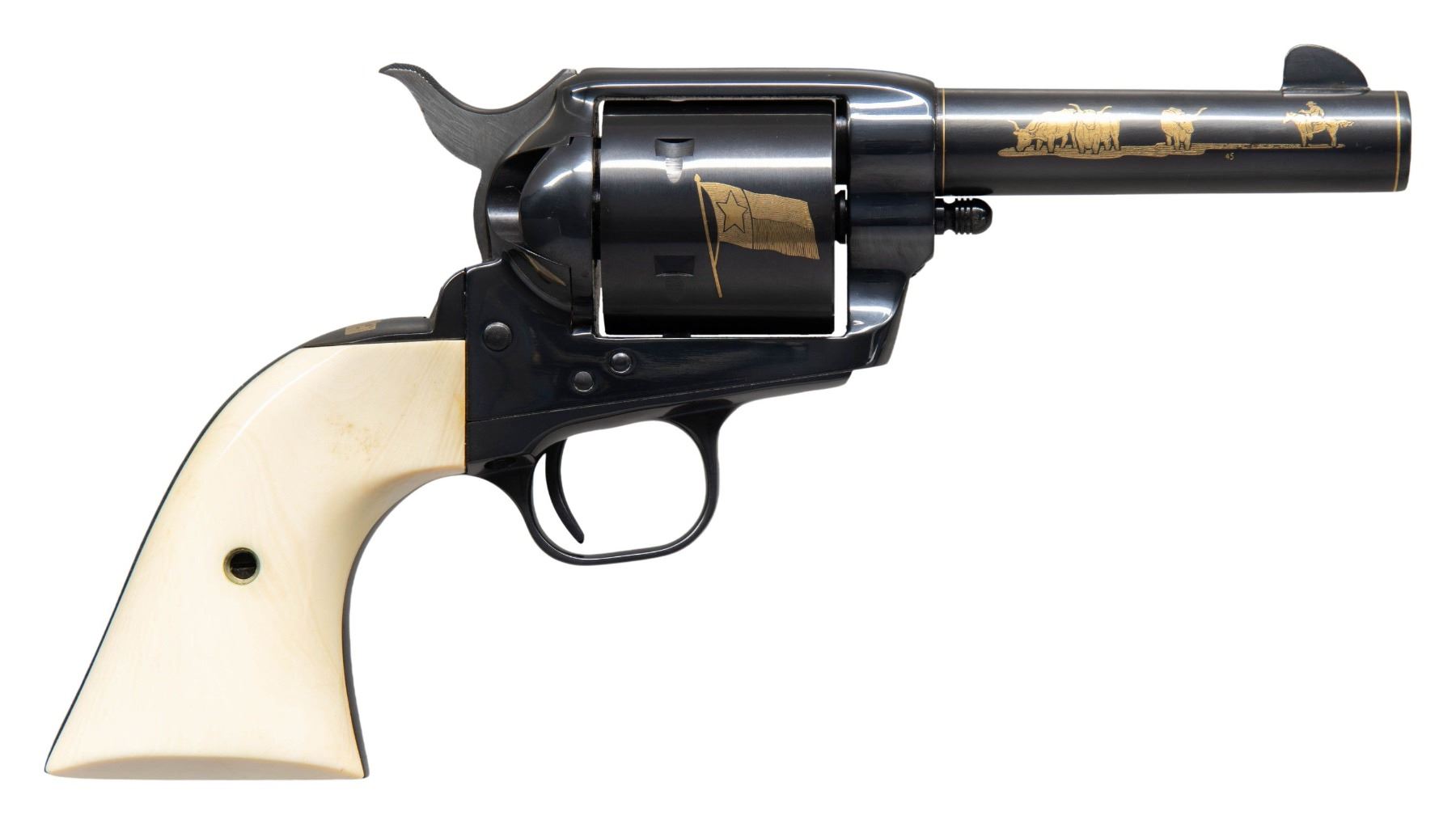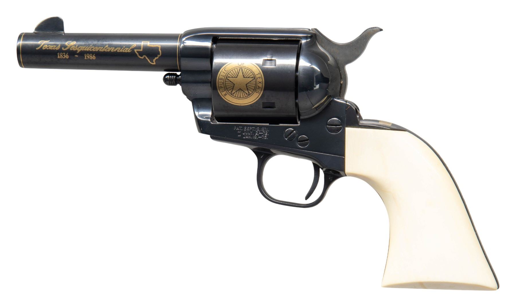 SESQUICENTENNIAL REVOLVER WITH DISPLAY CASE. Cal. 45. S# TX0746. Bbl. 4". Single Action Army Sheriff's Model Texas Sesquicentennial revolver mfg. by Colt in 1986. Bbl. features a single gold band at the breech and muzzle, with "Texas Sesquicentennial/ 1836-1986", followed by an outline of the state of Texas in gold on the left, with a scene of 3 steer and a cowboy marked on the right. Left side of the black powder frame is marked with Colt's 3-line patent information. Cyl. is marked with the Texas flag and state seal in gold. Top of rear grip strap is features the Alamo Mission in gold above "COME AND TAKE IT" in gold characters. Metal components exhibit a blue finish overall, save for on the sides of the hammer, which are polished in-the-white. Frame is mounted with 2-piece plain natural white grips. Standard SAA pattern blade front sight with square frame notched rear sight. All serialized parts are matching and include the frame, cyl., bbl., as well as the grip straps (beneath left grip panel). Grips are matching via "0746" which is handwritten on the interior of the panels. UNATTACHED ACCESSORIES: wood commemorative display case featuring a red felt lined interior and commemorative plaque. CONDITION: fine, with metal components retaining virtually all of their original factory blue finish overall. Cyl. exhibits no dragline. Sides of hammer (particularly the left side) exhibit small scattered spots of light surface oxidation, with the right side exhibiting some striations from prior cleaning. Mirror bore, exhibiting some hardened grease while retaining well defined rifling throughout. Proper manual mechanics (with cyl. removed to preserve condition). Grips show a faint yellow tinged patina, with a few light superficial handling marks present overall. Case shows scattered scratches and superficial handling marks, but otherwise remains sound. (25-1208/MLW). MODERN. $1,000-2,000.