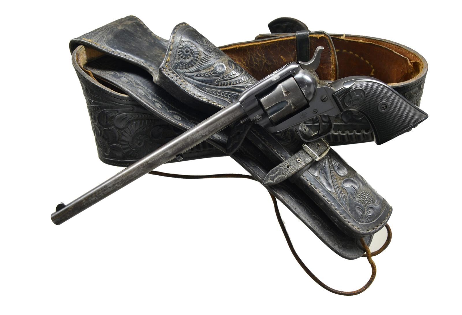 REVOLVER. Cal. 22. S# 80178F. Bbl. 9.5". Mfg.1959. Blued finish. Blade front & notch rear sights. 6-shot fluted cylinder. Checkered hammer spur. 2 Pc. black checkered grips w/ Colt pony. UNATTACHED ACCESSORIES: black leather gun belt & holster. CONDITION: finish on barrel & cylinder thinned to grey, spotty w/ light patina. Frame finish more complete & consistent w/ thinning on high spots & top strap. Timing seems correct. Bore is descent & strong rifling. (22-6012/JZ). CURIO. $300-400.