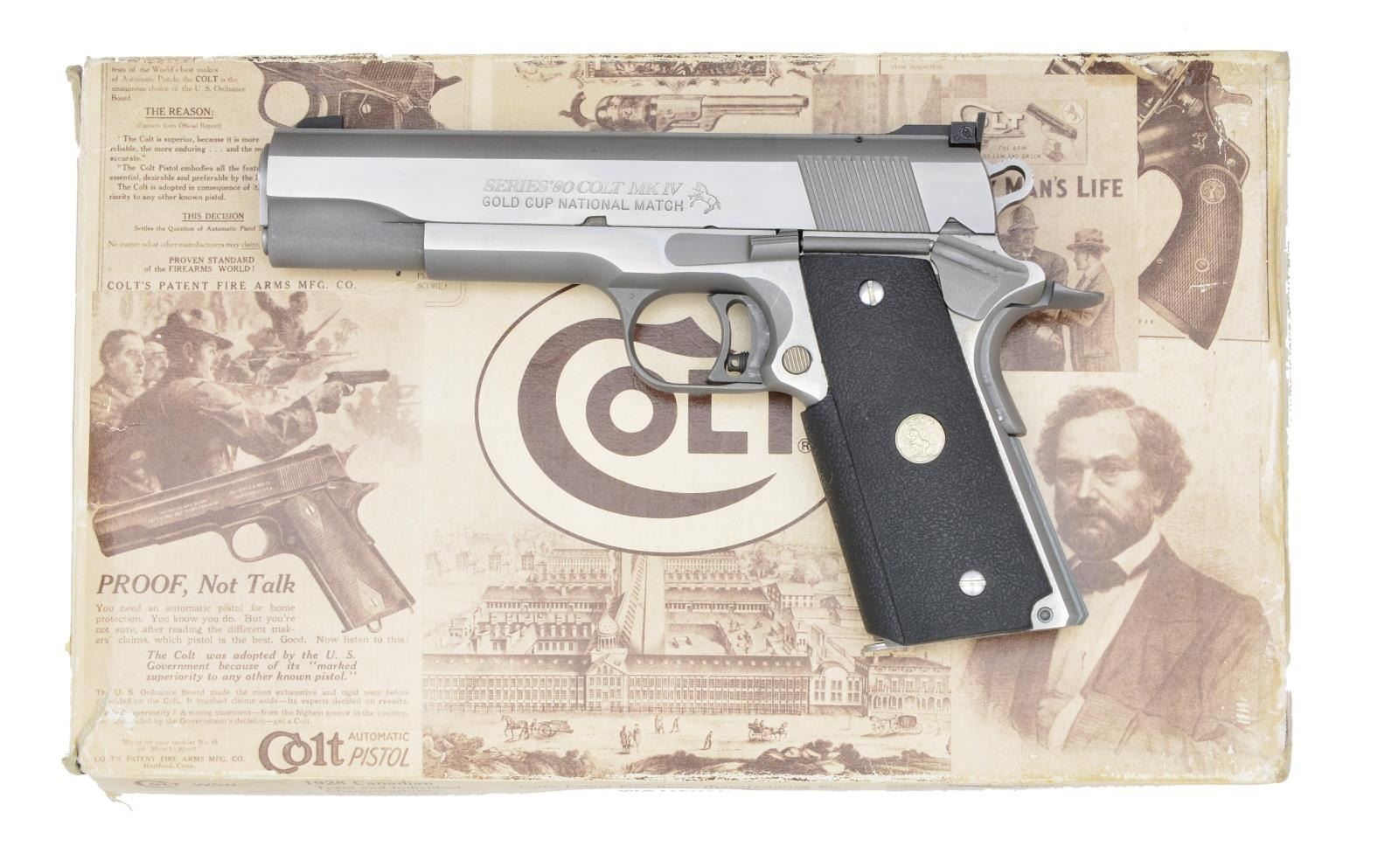 PISTOL. Cal. 45 ACP. S# SN10394E. Bbl. 5" NM (National Match). Mfg. 1994 as Gold Cup National Match having mill finished sides of frame & slide w/ matte finished edges. Raised grooved rib on slide w/ blued Patridge front sight & blued Elliason rear. Square cut cocking grooves plus flared & lowered ejection port along w/ polished & throated barrel / feed ramp. Wide NM trigger w/ over travel adjustment plus skeletonized hammer. Beavertail grip safety & grooved flat mainspring housing. Black pebble grained wrap around grips w/ silver Colt Medallions & stainless screws. MAGS: 1 stainless factory 8 rd. UNATTACHED ACCESSORIES: factory blue plastic case w/ packaging plus matching numbered outer sleeve indicating enhanced model. End opposite label secured w/ cellophane tape. CONDITION: all aspects near excellent w/ unfired appearance. (22-223/NW). MODERN. $800-1,200.