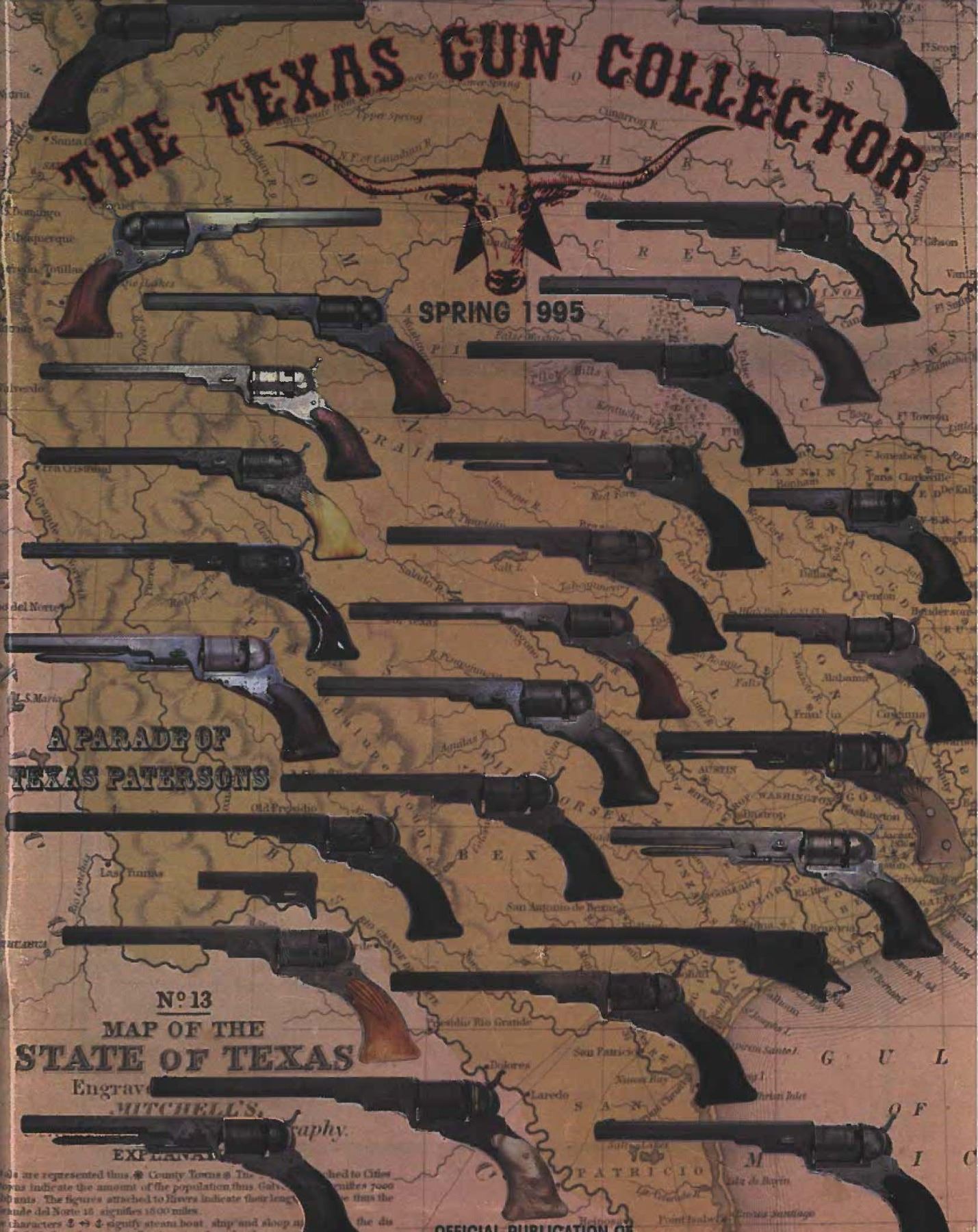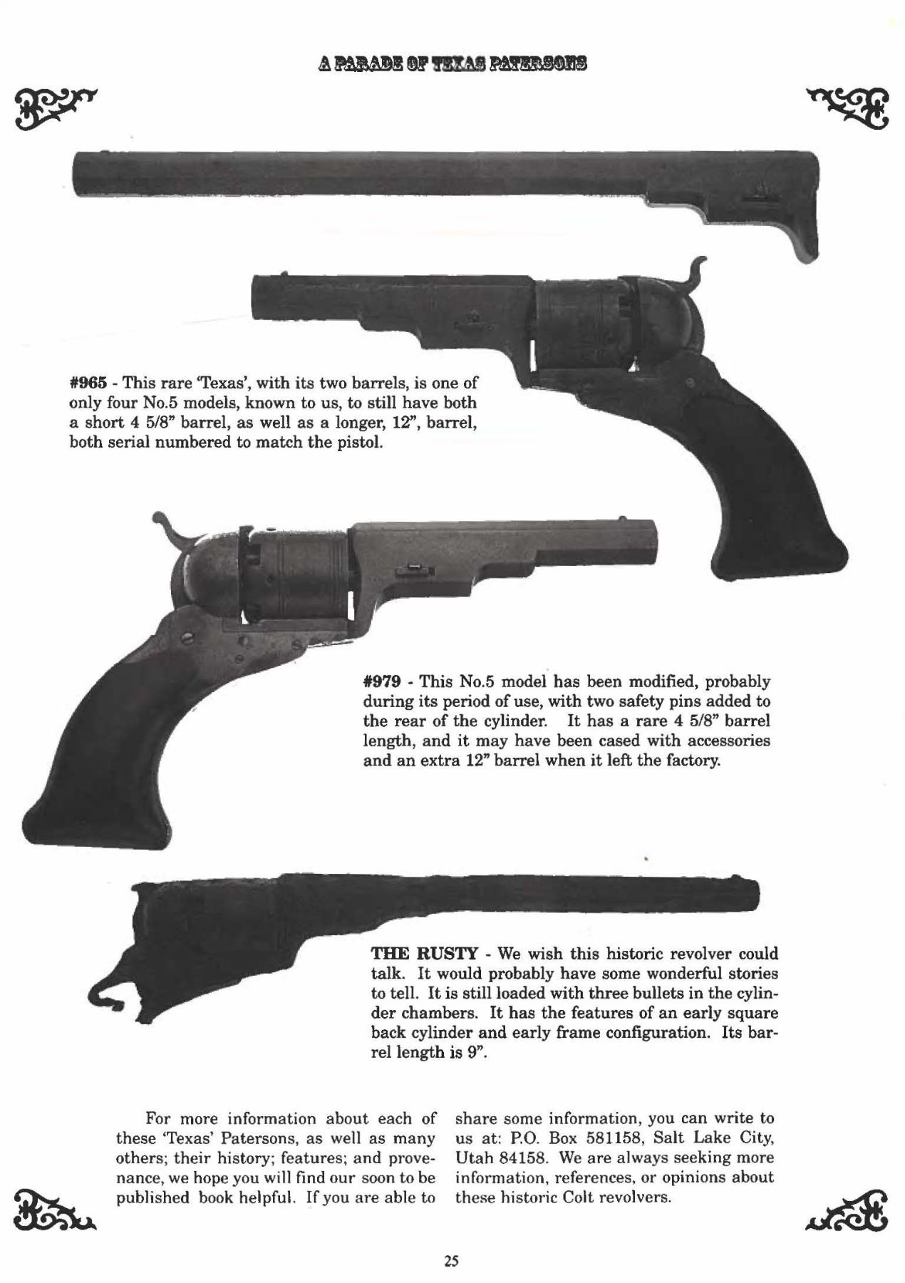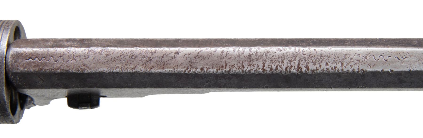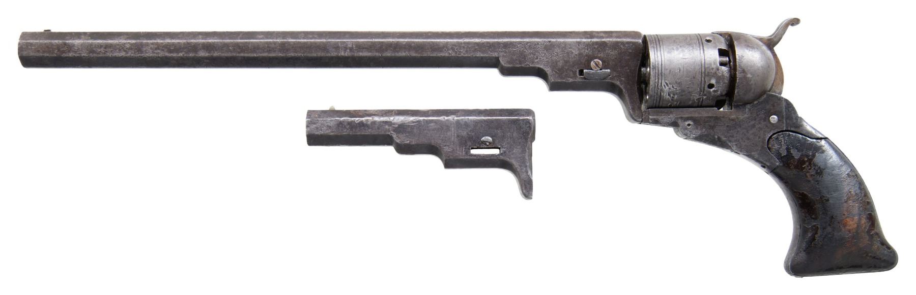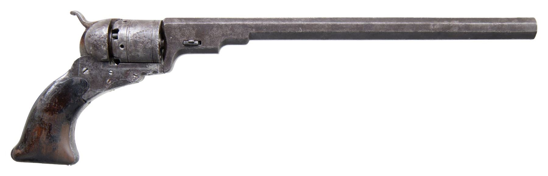 SET. Cal. 36. S# 965. Rarely seen Texas Paterson with 12" & matching 4 7/16" barrels. This revolver is published in the Texas Arms Collectors "Parade of Patersons" with copy included in lot. The No. 5 Holster Model Texas Paterson is the holy grail of early colts along with Walkers. 1000 Texas Patersons were made 1838-1840 and 4 documented survivors are known with both long & short barrel sets. The revolver conforms to standard configuration with 5-shot cylinder with rolled stagecoach holdup scene marking, tiny silver blade front sights, 12" barrel has Colt Paterson address, short barrel does not, varnished 1-piece walnut grips. Serial number was observed on the rear face of both barrels, cylinder, cylinder rotating ring, bottom of grip strap, and wedge. Revolver was not disassembled as it is well known and published in several texts. UNATTACHED ACCESSORIES: undated Hal Retting, Colt Industries note with attached description of revolver. Copy of Texas Gun Collectors "Parade of Texas Patersons" 1995 edition of bulletin, copy of pertinent pages from Colt Paterson texts. CONDITION: good overall, all original and matching, noted restoration is restored hammer spur, replaced wedge screw on long barrel, and 1" inset to grip at inside right toe, grips retain about 20% original varnish, traces of blue are found on both barrels with numerous small nicks and scratches, cylinder was mostly discerned cylinder scene with areas of pitting, barrel address appears purposely mostly removed-but partially discerned. Mechanics are functional, sharp multi-groove Paterson rifling. PROVENANCE: Found in Izmar, Turkey in 1961; Paul Sorrell collection; The Esteemed Norm Greenberg Collection. (01-27660/JS). ANTIQUE. $50,000-75,000