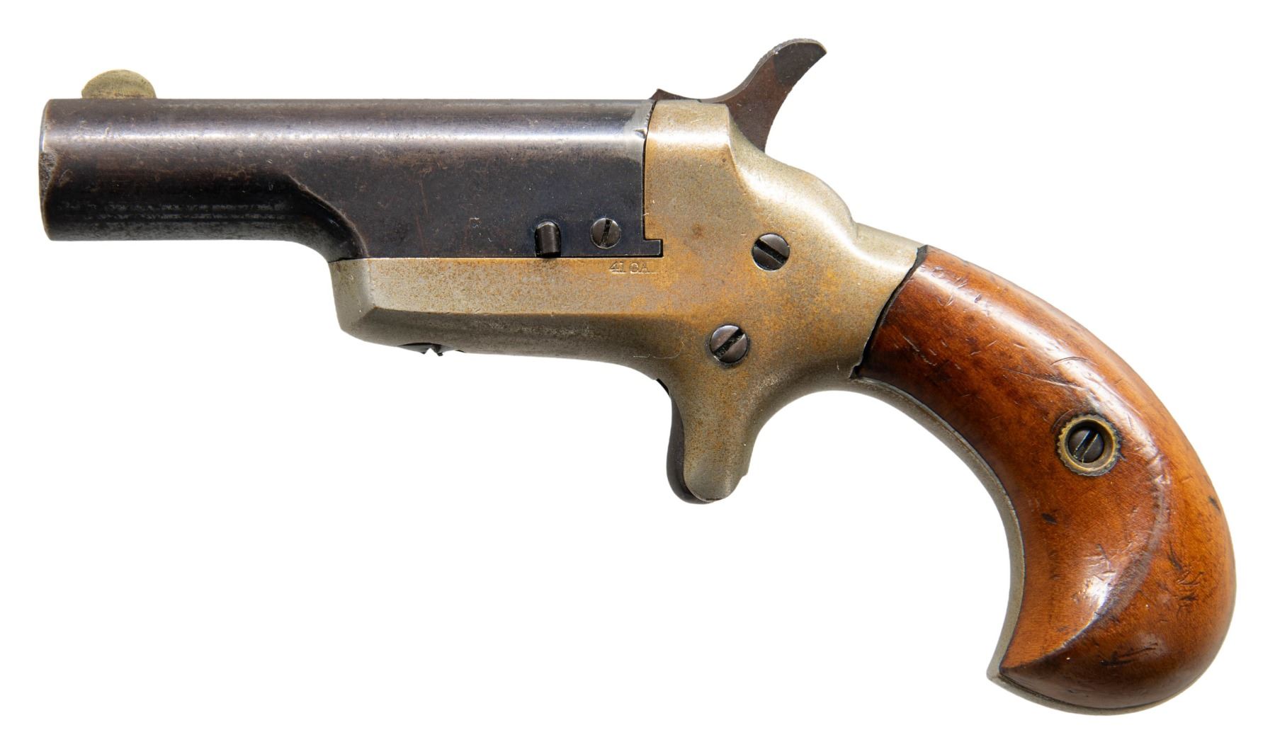 PISTOL. Cal. 41 RF. S# 20382 (beneath left grip panel). Bbl. 2 1/2". Third Model Thuer single shot derringer pistol mfg. by Colt. Top of the bbl. is marked "-COLT-". Left side of the frame is marked "41 CAL". Brass frame exhibits a nickel plated finish. Steel bbl., trigger, and hammer are blued. Frame is mounted with 2-piece plain wood birds head grips. Brass half-moon blade front sight. Grips match the frame via the full S#, which is faintly handwritten in pencil on the interior of the panels. CONDITION: frame retains fair to good amounts of its original nickel plated finish, showing wear and thinning that shows through to a mellow patina. Blued parts retain large amounts of their original finish, showing mild wear and thinning, some scattered scratches, and scattered spots of light surface oxidation. Very bright bore, exhibiting a few spots of dark surface oxidation towards the muzzle, while retaining well defined rifling throughout. Proper manual mechanics. Grips show scattered superficial marks and minor impressions, but otherwise remain sound. PROVENANCE: The Esteemed Norm Greenberg Collection. (25-4145/MLW). CURIO. $500-800.