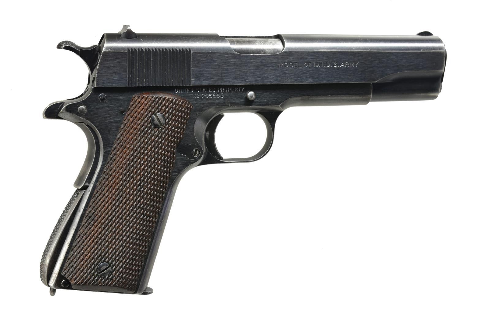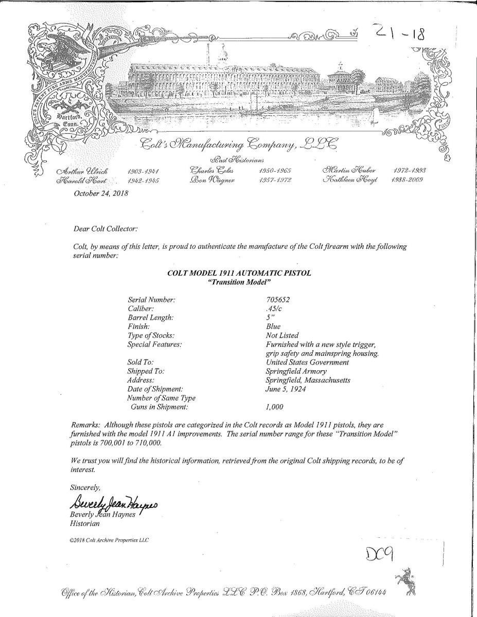 Cal. 45 ACP. S# 705652. Bbl. 5". Shipped June 5, 1924 (1,000 units) to Springfield Armory. Per factory letter, transitional features of 1911 A1 to include: trigger guard relief cuts, trigger, grip safety & mainspring housing. Most correct transitional model features including 1911 marked slide, 60 assembly # on trigger guard, full checkered walnut grips, WTG proof & Colt type 5 bbl. Type 3 arched mainspring housing w/ lanyard loop & coarse checkering having 27 diamonds rather than 32. Thumb safety & slide lock checkered w/out milled undercut. Harrison's reference book states "P" proofs not present yet "P" is on slide & very faint on frame (only vertical line visible). H provisional acceptance mark only on top of frame; missing on bbl. & slide. No S# under firing pin stop. MAGS: very good 7 rd. 2 tone Model 1911 w/out lanyard loop by American Pin Co. UNATTACHED ACCESSORIES: Oct. 24, 2018 factory research letter. CONDITION: very good overall, original Colt brushed blue finish w/ holster like high point wear plus hand wear. Flaking appearance & light marks on front strap & top left front of slide. Light oxidation on sides of frame along outside edges of grips; not visible unless grips removed. Noticeable exterior bbl. wear w/ gray tone; very good bore w/ faint frosting & hint of wear. Occasional light marks & sm. scattered spots of peppery oxidation plus light impact marks on right rear corner of slide. Good to very good grips w/ some flattening of diamond tops plus worn finish on screws. (21-18/NW). CURIO. $2,000-3,000.