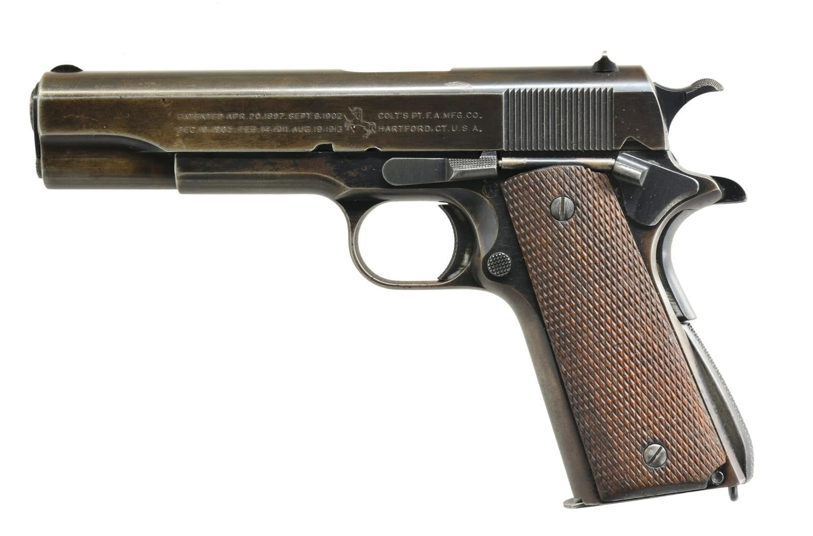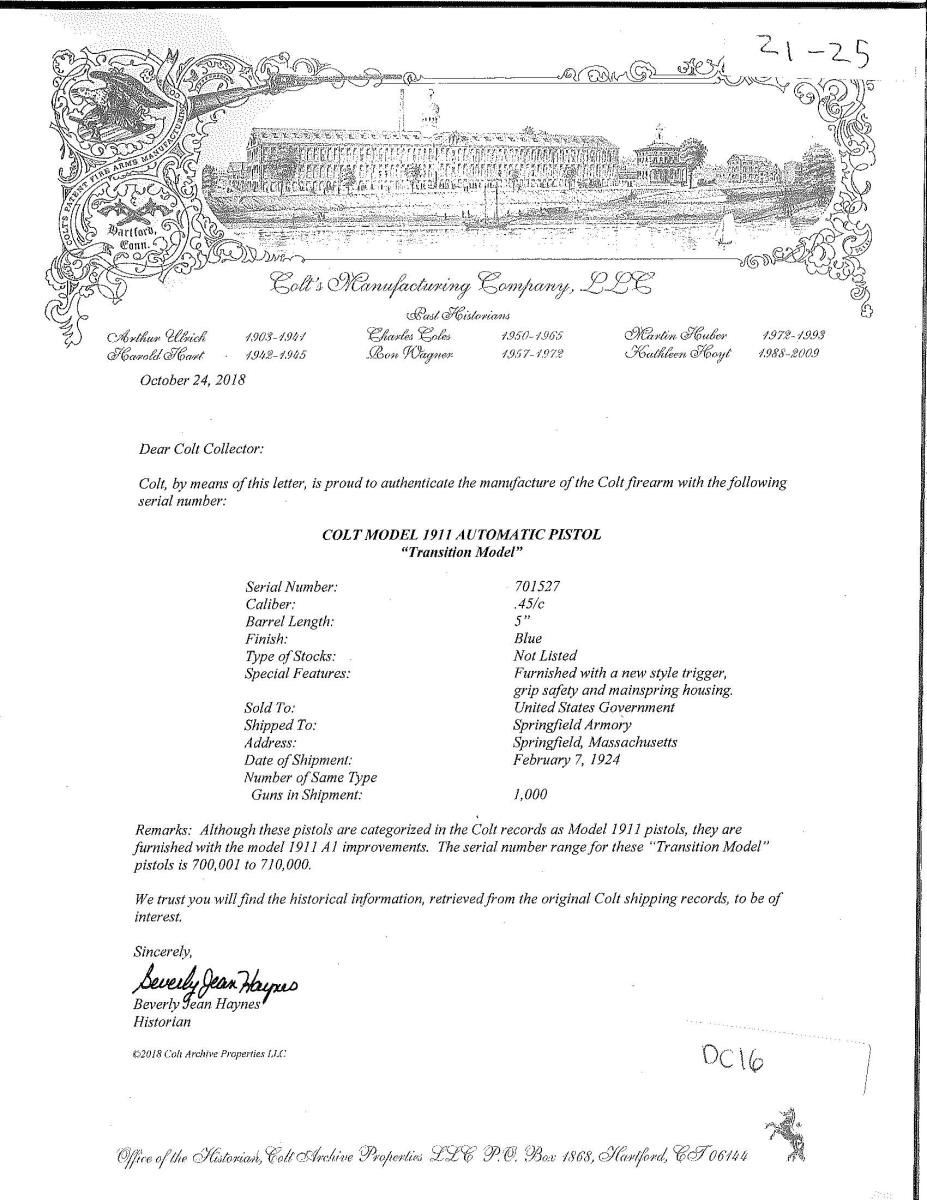 Cal. 45 ACP. S# 701527. Bbl. 5". Shipped Feb. 7, 1924 to Springfield Armory; 1,000 units. Most correct transitional features including: trigger relief cuts, short trigger, long tang safety & coarse checkered Type 3 mainspring housing w/ 27 diamonds (not 32). Checkered thumb safety & slide stop w/out milled undercuts. Properly marked slide w/ 1911. Frame w/ “WTG” inspection mark. Full checkered walnut grips. Slide not numbered under firing pin stop. “H” acceptance mark on rear of slide & by disconnector also having “G”; Type 5 bbl. w/ “8” in front of legs. Correct front sight & U-notch rear. MAGS: 1 good unmarked 2 tone 7 rd. UNATTACHED ACCESSORIES: 2018 dated factory letter. CONDITION: good to very good appearance w/ Colt Brushed Blue. Very clear markings throughout. Noticeable thinning on front strap w/ brown tone plus slight holster like high point wear on slide & dust cover. Thinning finish throughout mixed w/ beginning patina in grip area & occasional spot of peppery oxidation. Very faint mark from improper slide stop installation. Good plus grips w/ even light diamond top wear; worn screw finish. Worn bbl. finish w/ scattered light oxidation plus patina appearance at port area. Good to very good bore w/ faint wear & even traces of light pitting. (21-25/NW). CURIO. $1,500-2,000.