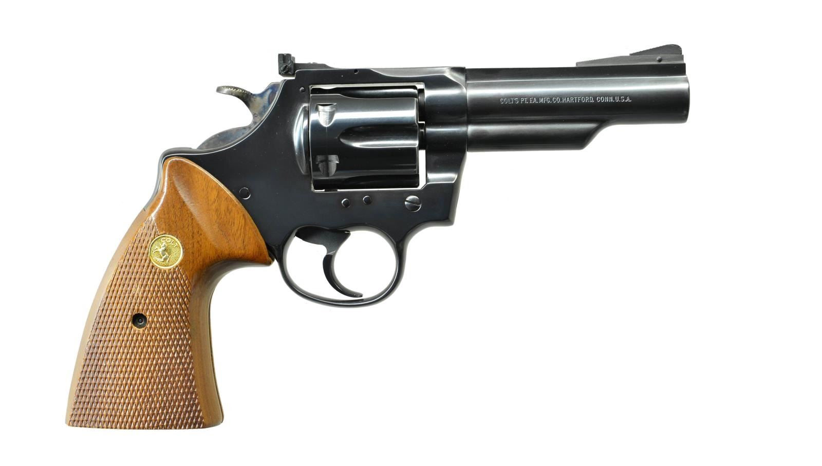 Cal. 22 Mag. S# Y11052 (1980). Bbl. 4" w/ ramp front sight & square notch adj. rear sight. Blue finished w/ 6 shot swing out fluted cyl. Checkered walnut target grips w/ gold Colt medallions. UNATTACHED ACCESSORIES: Colt wood grain box w/ matching numbered label containing hang tag, & paperwork. box in fair condition w/ lg. tears to end flaps. CONDITION: near excellent overall w/ only a faint cyl. turn line & minimal marks. Near excellent bore. PROVENANCE: Estate collection of Fred Inganamort. (22-1771/MD). MODERN. $700-1,000