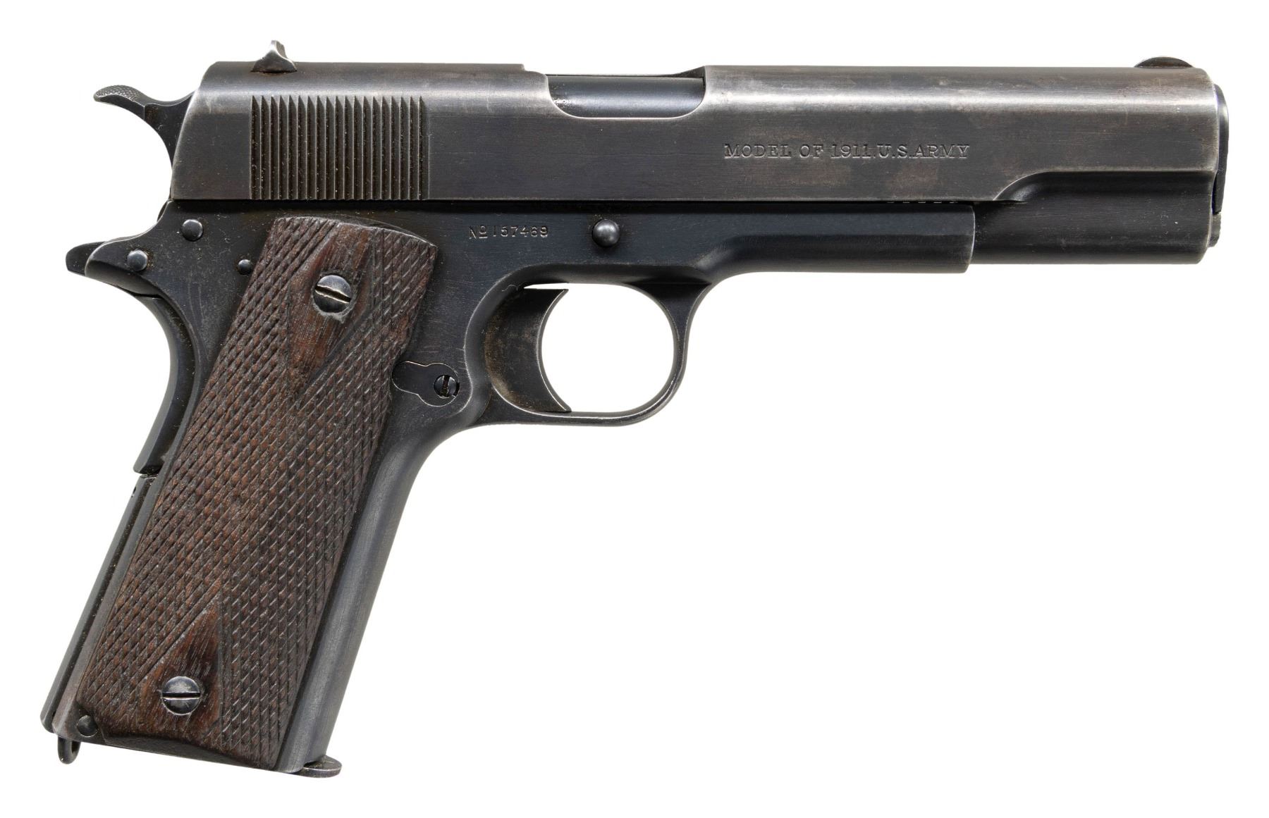 Cal. 45 ACP. S# 157469. Mfg. 1917. Based on " including Type 4 Colt 5" barrel & dbl. diamond walnut grips. Barrel has "HP" proofs on top & "5" on left lug & bottom. MAGS: 1 M.S. Little 7 rd. mag. CONDITION: barrel, slide, frame & small parts have old reblued finish showing scratches, prior pitting & acquiring patina predominantly on slide. Good grips with small gouges & wear to diamonds. Fair rifling with pitting. (25-4414/MD). CURIO. $1,000-1,500.