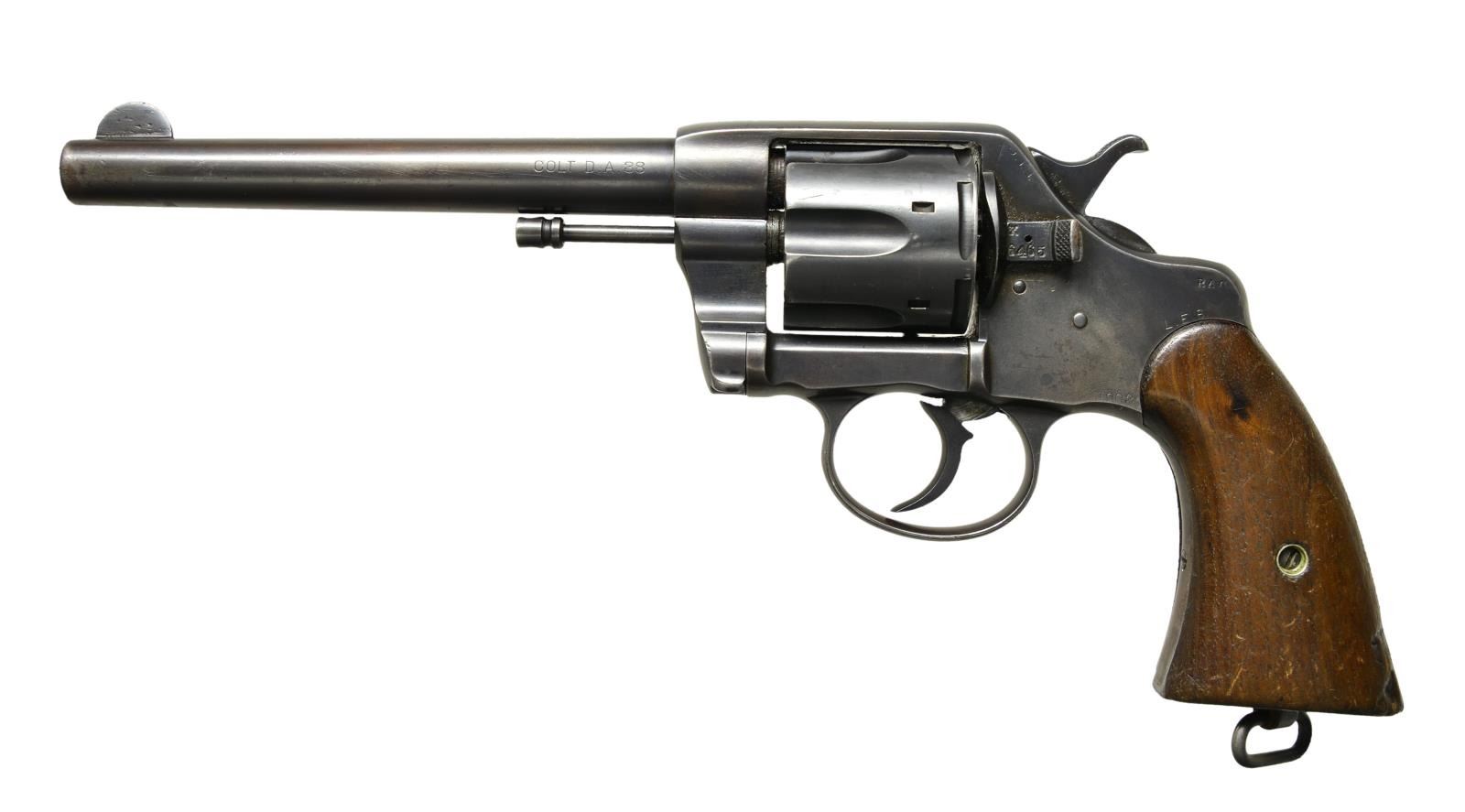 Cal. 38 Colt. S# 196465. Bbl. 6 " with blade sight, 1895 last patent date plus frame notched rear sight. Mfg. 1903 (1892-1907) with matching 6465 numbers on frame, crane, side plate and cylinder release. "RAC" military inspector marks on top left rear of frame, rear of cylinder (twice) and bottom of barrel (plus "P") next to frame. "l.E.B." above left grip. Appears to be 'O.1.1" at top left of frame. "1903" on frame by top front of left grip. 6 rd. cylinder with short flutes and 2 sets of stop notches; counter clockwise rotation. Smooth oiled walnut grips with 8716 penciled on back of left. Lanyard loop on butt along with faint cleaned model markings and barely readable serial number. Checkered hammer plus smooth trigger and backstrap. CONDITION: good overall appearance as refinished. Handling marks on grips; especially left at butt. Trigger does not return well as if weak spring. Fair to good bore with light wear and even frosting. (22-6069/NW). CURIO. $300-400.