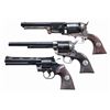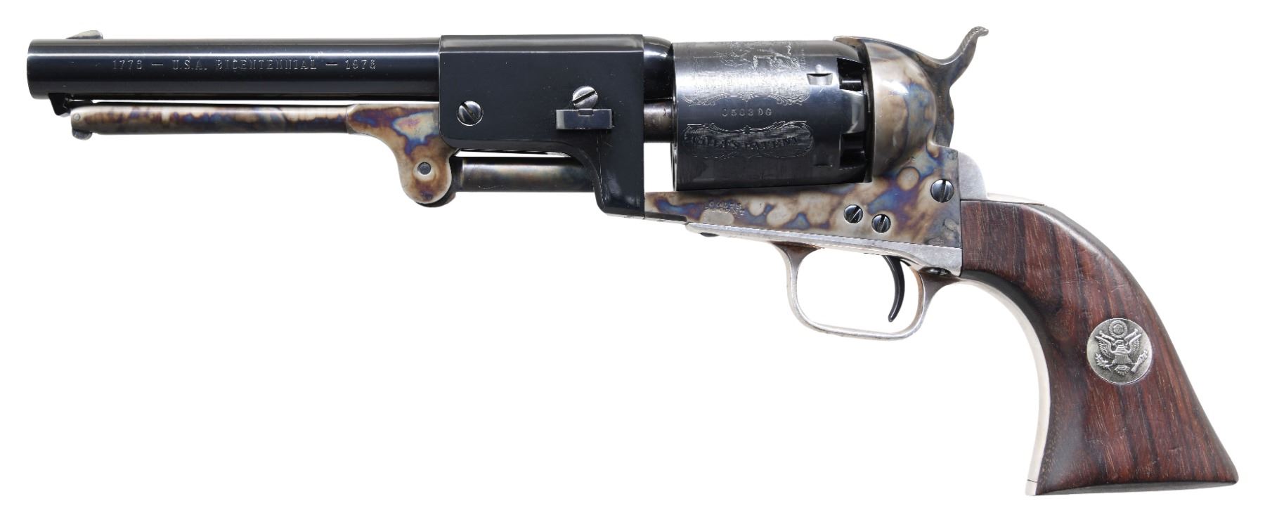 Colt 1976 US Bicentennial Three Revolver Cased Set. Revolvers are housed in a three drawer walnut display case w/ a hardbound copy of the book, "ARMSMEAR, in memorial of Samuel Colt". Left side of bbl. for all three revolvers are marked "1776-U.S.A BICENTENNIAL-1976". Left grip panel of all three revolvers have circular American eagle medallions.