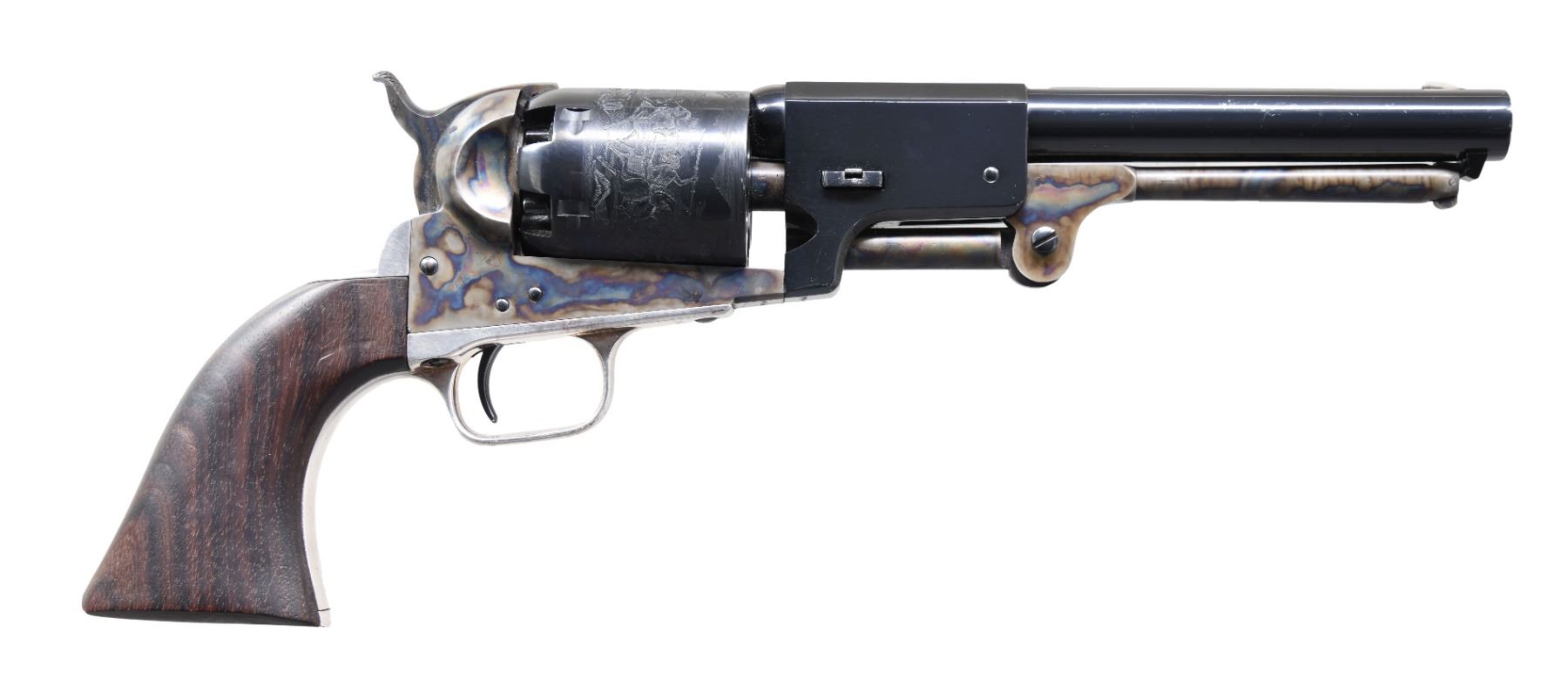 GUN 1: 3rd Model Dragoon. Cal. 44. S# 0503DG. Bbl. 7 1/2" round w/ octagon shank & blade front sight. Roll engraved six shot cyl. Blue & case colored finish w/ silver finished grip straps. Rosewood grip. CONDITION: over 98% finish showing scattered scratches & handling marks. Silver finished grip straps are beginning to acquire a mild tarnish. Bright near excellent bore, appears unfired. (01-26573/DS). ANTIQUE.