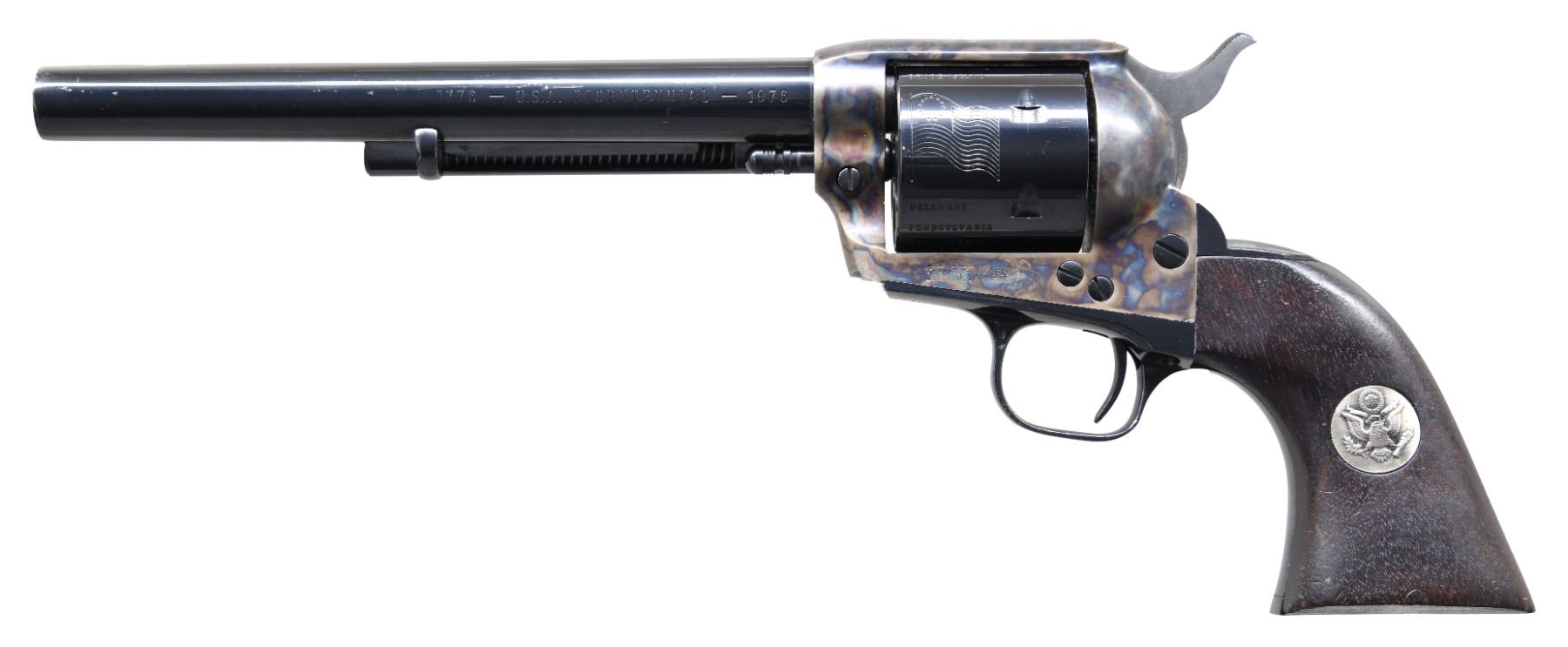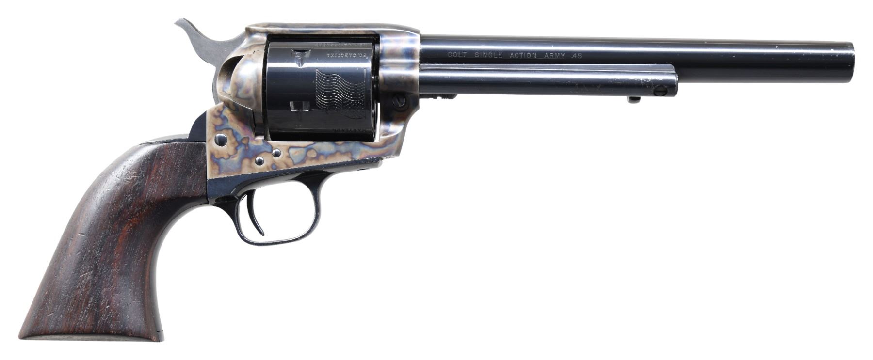 GUN 2: Colt Single Action Army Revolver. Cal. 45. S# 0503PM. Bbl. 7 1/2". Round six shot cyl. depicts the thirteen star American flags & lists the original thirteen colonies. Blue & case colored finish w/ polished hammer sides. One piece rosewood grip. CONDITION: wood & metal surfaces show numerous scratches & handling marks. Front sight is missing. Bright near excellent bore. (25-923/DS). MODERN.
