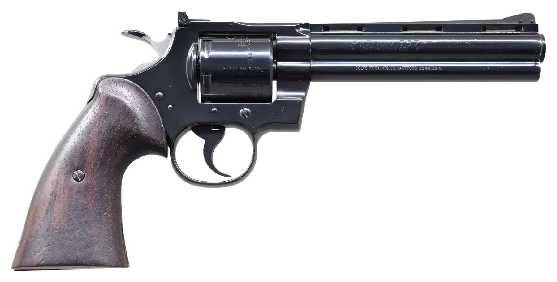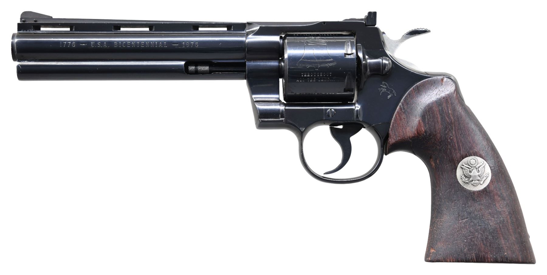GUN 3: Colt Python Revolver. Cal. 357 Mag. S# 0503PY. Bbl. 6" w/ vent rib & full lug. Serrated ramp front sight w/ square notch adj. rear sight. Six shot round cyl. is roll engraved w/ statue of liberty, liberty bell, the US capitol & patriotic inscriptions including "give me liberty or give me death". Blue finished w/ polished hammer sides. Two piece rosewood grips. CONDITION: metal surfaces show scattered light scratches. Grips show wear & handling marks, left panel is broken & glued behind trigger guard. Bright near excellent bore. (25-924/DS). MODERN.