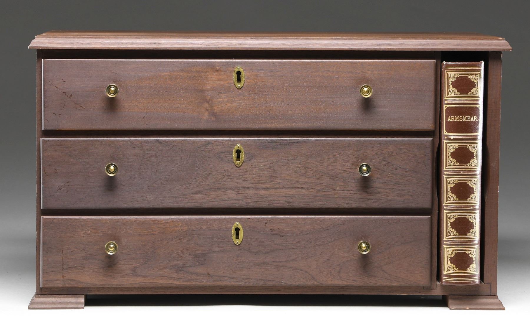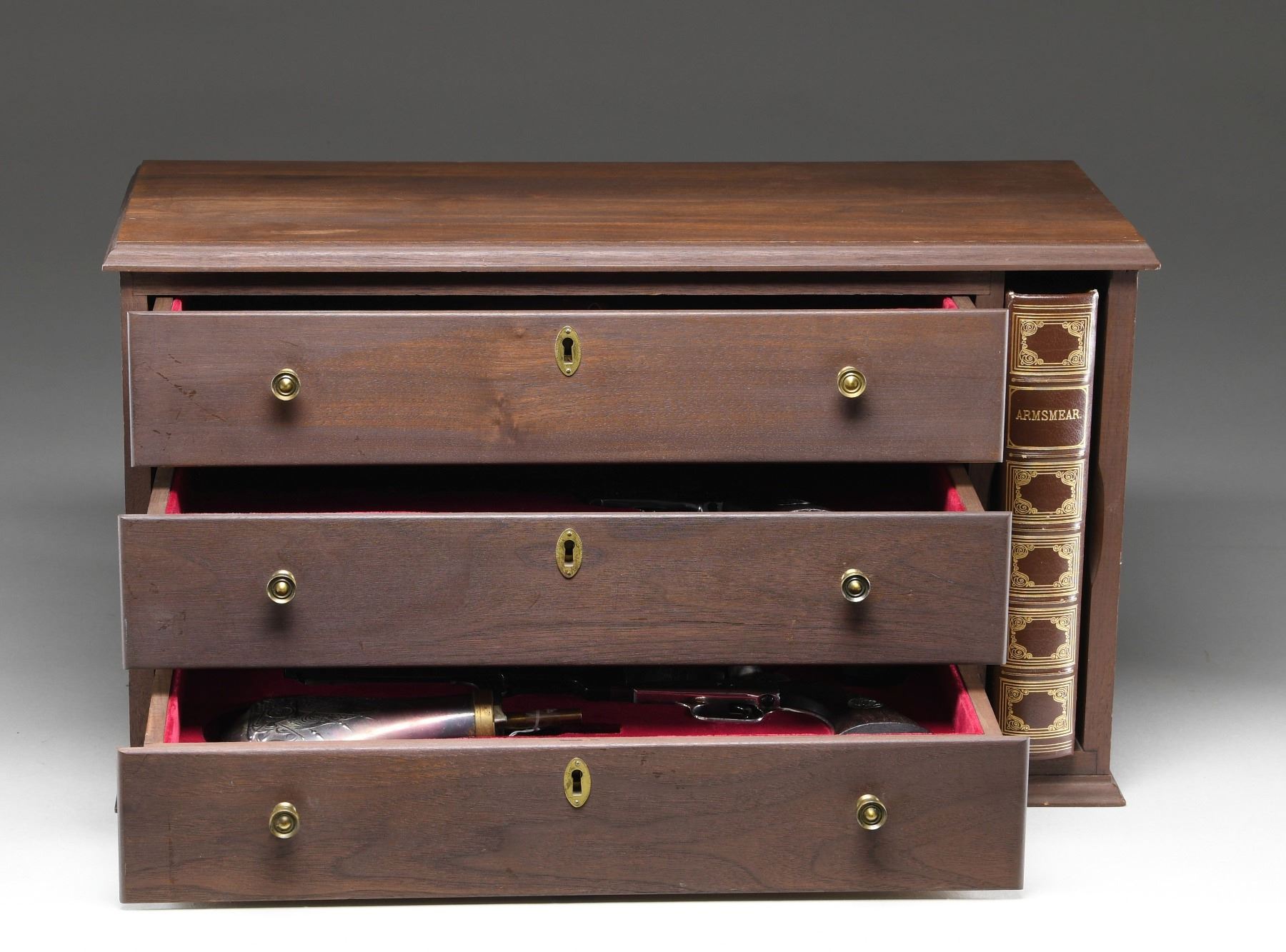 UNATTACHED ACCESSORIES: three drawer walnut case w/ side slot for the Armsmear book. Drawers have a red velour fitted interior. The dragoon drawer contains a powder flask & cap tin w/ empty slots for a bullet mold & a nipple wrench. CASE CONDITION: case is in very good condition showing only a few small marks. $3,000-5,000.
