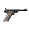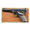 Cal. 22 LR. S# 134187-S. Bbl. 4 1/2" w/ serrated ramp front sight & square notch adj. rear sight. Mag. release is on left side behind trigger. Blue finish. 2 Piece checkered plastic thumbrest Coltwood grips. Mfg. 1947-1955. MAGS: 1 - 10 rd. detachable. UNATTACHED ACCESSORIES: 1 piece brown box w/ green interior having proper label. Box contains instruction pamphlet . CONDITION: retains over 97% blue showing light muzzle & edge wear. Very good grips. Bright, near excellent bore. (22-1073/DS). CURIO. $800-1,200.