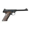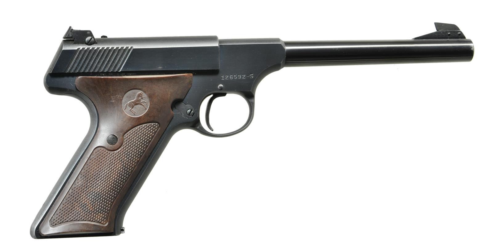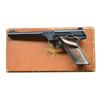 Cal. 22 LR. S# 126592-S. Bbl. 6" rnd. w/ ramp mounted Patridge front sight & square notch adj. rear sight. Mag. release is located on left side behind trigger. Blue finish. 2 Piece checkered thumbrest Coltwood plastic grips. Mfg. 1947-55. MAGS: 1 - 10 rd. detachable. UNATTACHED ACCESSORIES: one piece brown box w/ green interior. Box contains instruction pamphlet, test target, grip extension & circular screwdriver. CONDITION: gun retains over 98% blue showing light edge & muzzle wear. Very good grips. Bright near excellent bore. (22-1074/DS). CURIO. $800-1,200.