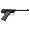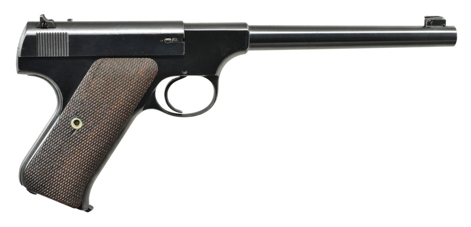 PISTOL. Cal. 22 LR. S# 58843. Bbl. 6 5/8" w/ pinned bead front sight & U notch rear sight. Blue finish. 2 Piece checkered walnut grips. Mfg. 1928. MAGS: 1 detachable 10 rd. CONDITION: 90% blue showing edge wear w/ scattered freckling & handling marks. Grips have darkened appearance w/ moderate wear. Right panel has crack extending from attachment screw to butt. Sound mechanics. Bright bore w/ sharp rifling. (21-4397/DS). CURIO. $700-1,000.