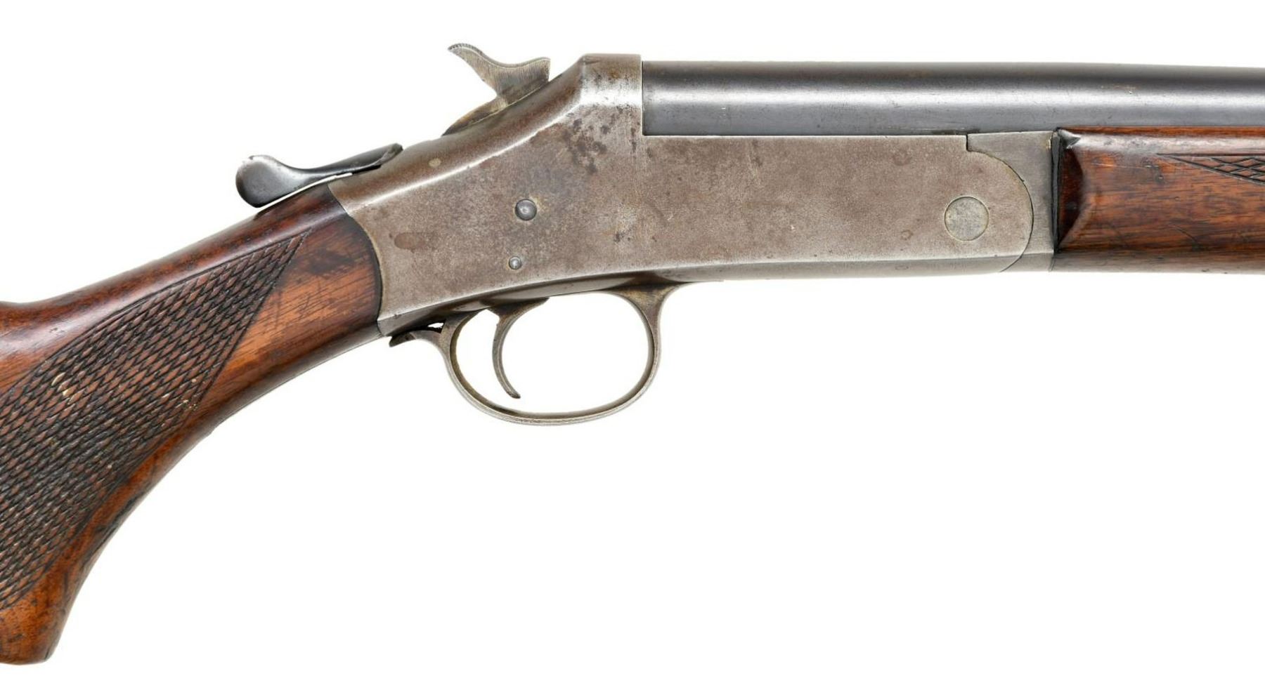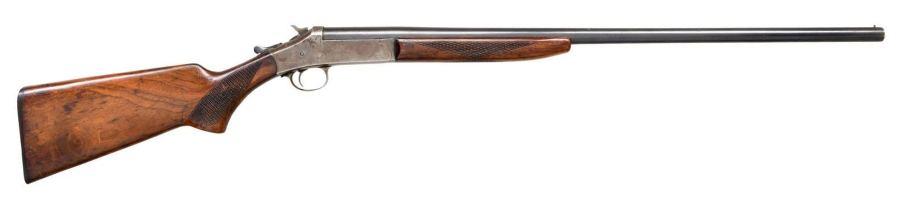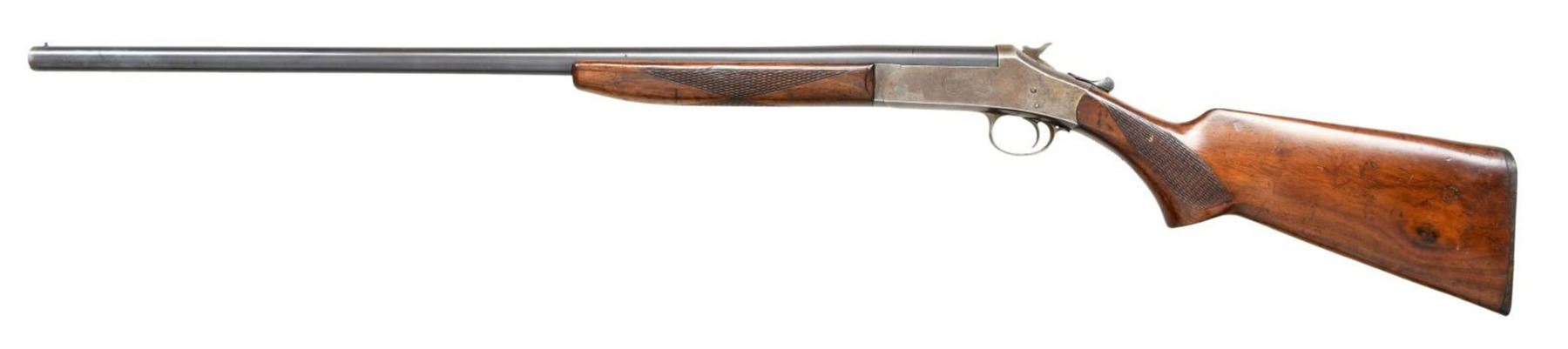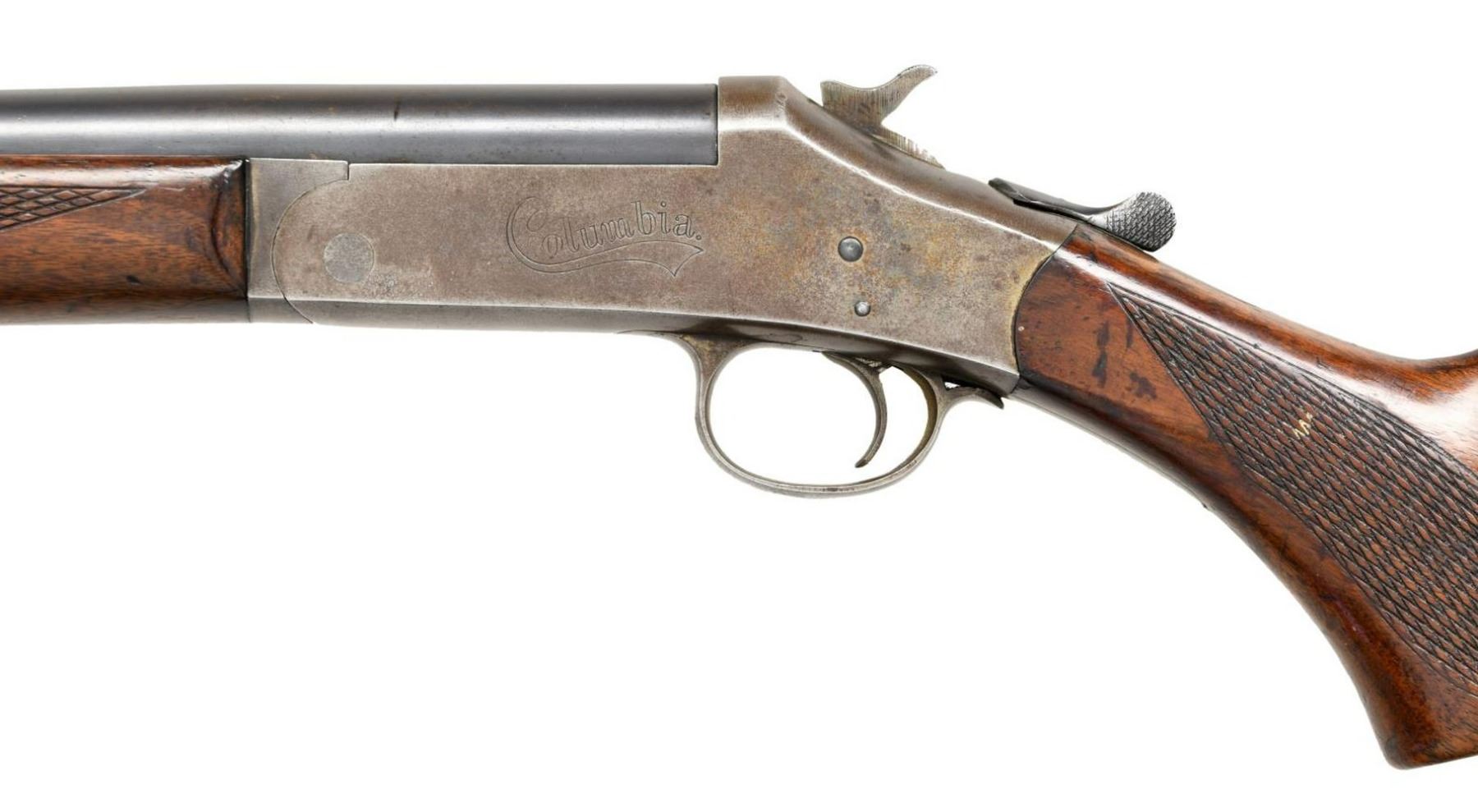1) COLUMBIA SINGLE SHOT SHOTGUN. Cal. 16 Ga. S# A561980. Bbl. 28", plain. Brass bead front sight. H&R used Columbia trademark until 1985. Checkered hardwood stock & forend. CONDITION: stock has added finish w/ crack behind upper tang, a couple cracks on forend, scattered dings, & handling wear. Frame is a gray patina w/ scattered oxidation. Bbl. retains 60% original blue w/ scattered light oxidation & flaking to brown. Very good bore. (23-2496/MJC). MODERN. 2) SAVAGE MODEL 3 BOLT ACTION RIFLE. Cal. 22 S, L & LR. NSN. Bbl. 24". Gold bead front sight. Sporting style rear sight. Single shot, bolt action rifle. Pistol grip stock w/ checkering on wrist. CONDITION: stock has added varnish w/ scattered flaking, dings, & handling wear. Metal retains 50% original blue w/ scattered fading to gray, edge wear, & light oxidation. Very good, bright bore. (23-2497/MJC). CURIO. $100-200.