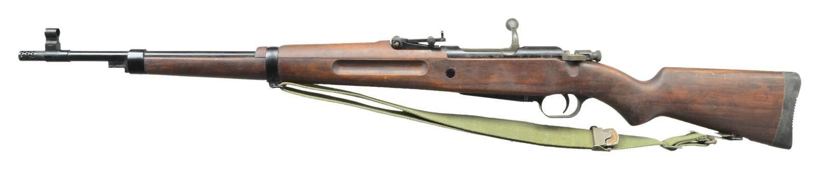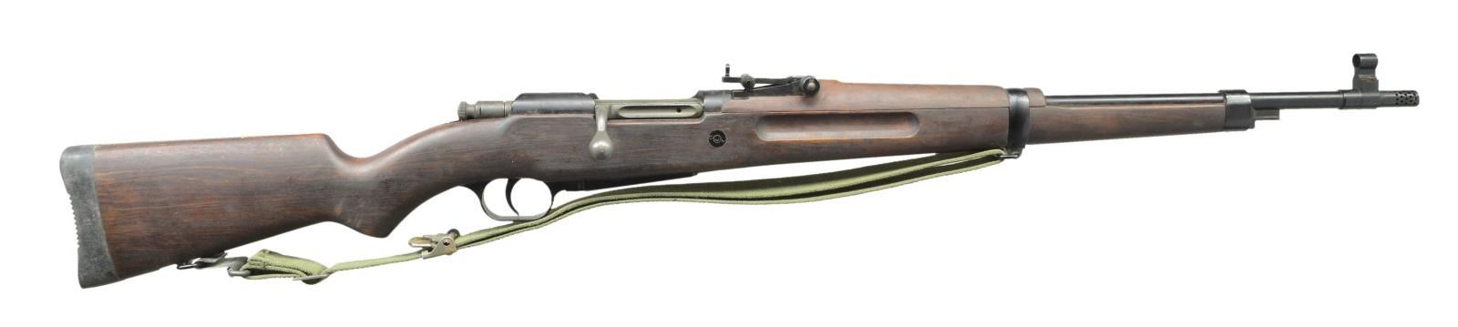 ACTION MILITARY RIFLE. Cal. 30-06. NSN. Bbl. 23 1/2". Receiver ring is marked on top "FUERZAS ARNADAS DE COLUMBIA". Left receiver rail is marked "MADSEN MG/A 1946-58 Cal. .30". Bent down bolt handle w/ flattened knob. Tangent aperture rear sight graduated to 900 meters. Post front sight w/ protective hood. Flush suppressor at muzzle. Upper band has bayonet bar. Walnut stock set w/ bottom swivels & grooved rubber buttplate. Green web US sling. CONDITION: stock set has light wear, staining & scattered handling marks. 85% original metal finish w/ light wear & handling marks. Very good shiny bore. (22-1944/RW). CURIO. $450-600.