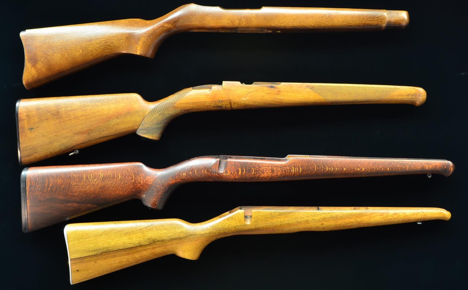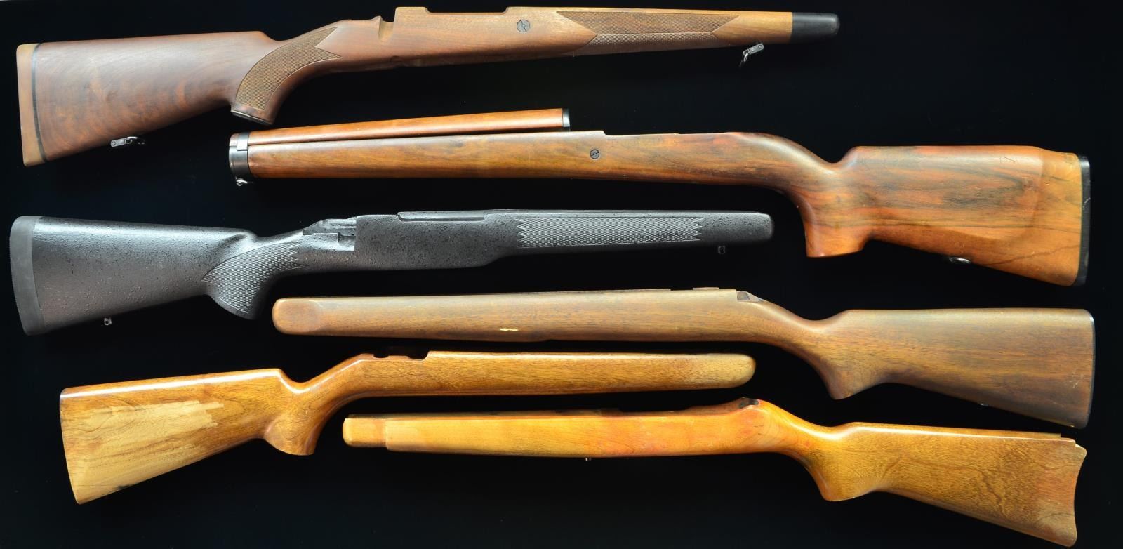 1) Whitworth Express stock for commercial Interarms Model 98 Style action; very good (sm. sanding marks by bolt sleeve location). Satin finished, raised cheek piece, solid recoil pad, case colored grip cap, black forend tip, detachable swivels, full checkering & recoil cross bolt. Appears for 458 Win Mag assembly. 2) Carl Gustaf target stock w/ handguard for Mauser based action; very good. Black plastic buttplate w/ Crown C logo. Includes swivels & ready for action assembly. 3) Bell & Carlson black synthetic sock for P-17 or 14. Solid black pad, checkering & splatter black finish; very good. 4) Ruger stained birch 10/22 stock w/ aluminum buttplate & altered bbl. channel; good. 5) Ruger stained birch 10/22 stock w/ out buttplate; good. 6) Schnable tipped stock for Mauser 98 style action w/ slide safety provision plus for stepped bbl.; fair w/ repairs. 7) Schnable tipped stock for Mauser 98 style action having Beretta pad, black plastic grip cap & glass bedding; good. 8) Unknown military appearing target stock for 22 RF having forend rail & grooved metal buttplate; good plus. 9) Schnable tipped stock for small cal. bolt action fitted w/ altered vintage Remington aluminum buttplate; good. 10) Unknown light walnut stock for straight pull or semi-auto. Sm. cal. w/ repair; fair.