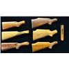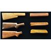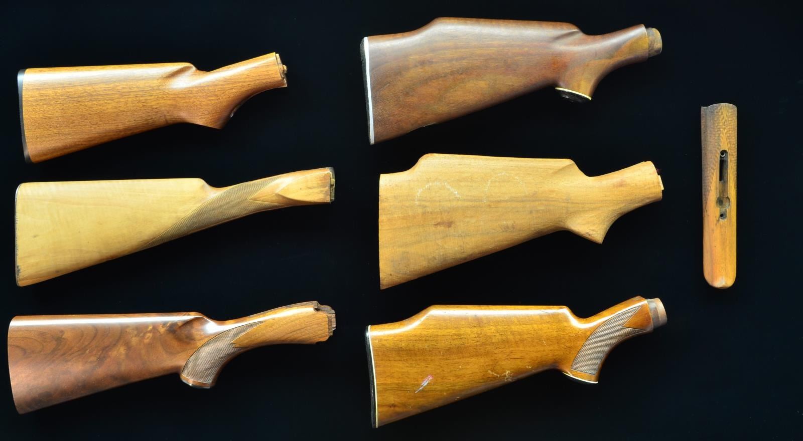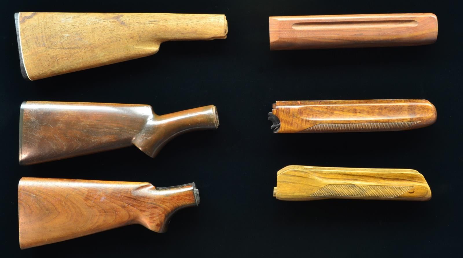 1) Ruger No. 1 buttstock w/out pad. Butt hand numbered 937 plus sticker advising torque of attachment bolt; near excellent. 2) Fajen semi-inletted for Winchester Model 92 w/ white spaced black plastic buttplate; very good. 3) Boyd's fully finished Browning Auto-5 buttstock w/ black plastic buttplate; near excellent. 4) Remington (?) Model 11 style, no buttplate; good. 5) Inletted semi-finished buttstock having raised Monte Carlo cheek piece. Similar to #3 & #4 but w/ top tang inletting between length; very good. 6) Finished finger grooved forend of Auto-5 style having plastic spacer internally at front; near excellent. 7) Winchester (?) similar to M-12 w/ long sloping grip, internal lead weight at grip area & Winchester logo buttplate. 8) Unknown straight grip boxlock buttstock w/ very long bottom tang. Remington checkered steel buttplate; good. 9) Splinter forend believed for #8; good. 10) British Enfield buttstock w/ raised Monte Carlo cheek piece, white line grip cap, inletted for military style swivel base & checkered aluminum Remington buttplate; very good. 11) British Enfield checkered buttstock by Sile (?) w/ raised Monte Carlo cheek piece, white line grip cap & buttplate plus drilled for sling stud; good plus. 12) Unknown checkered O/U forend w/ iron having European appearance such as Valmet; near excellent. 13) Unknown checkered forend of hardwood w/ 3 panels of checkering; near excellent. (02-16809-7/NW). $500-750.