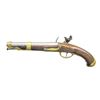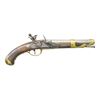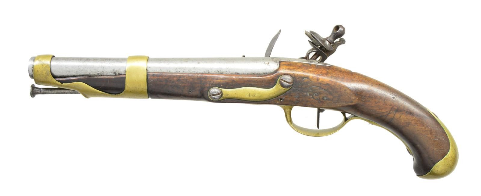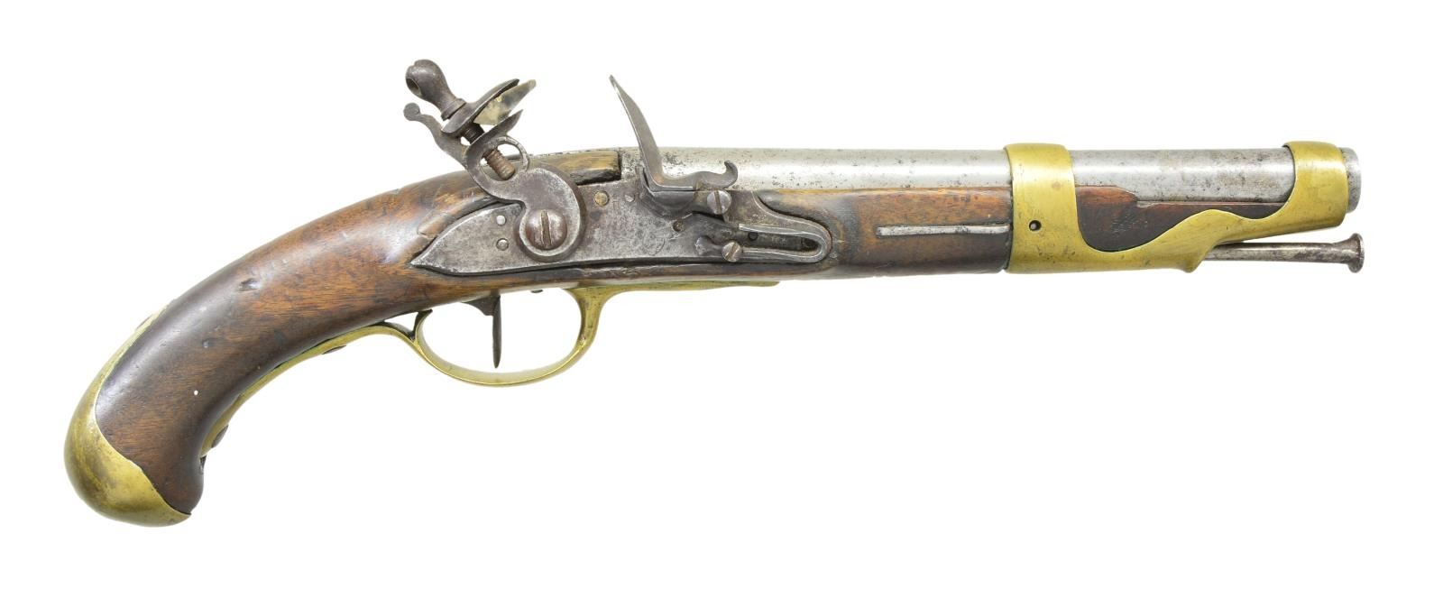 MAUBERGE" FRENCH FLINTLOCK PISTOL. Cal. 65. NSN. Bbl. 9" w/ smoothbore. Lock has crown over bead proof above a largely obscured Mauberge marking. Band fastened walnut stock. Left ear has numerous lightly visible markings. "CP" marking is found on the bottom of the forearm forward of the trigger guard. Brass fittings include butt cap, trigger guard, side plate & bbl. band. Button tip iron ramrod. CONDITION: metal has cleaned gray appearance w/ light pitting. Stock shows heavy wear w/ light marks & chip at right side of forearm. Functioning lock. Dark lightly pitted bore. (01-23049/DS). ANTIQUE. $1,000-2,000.