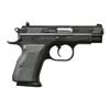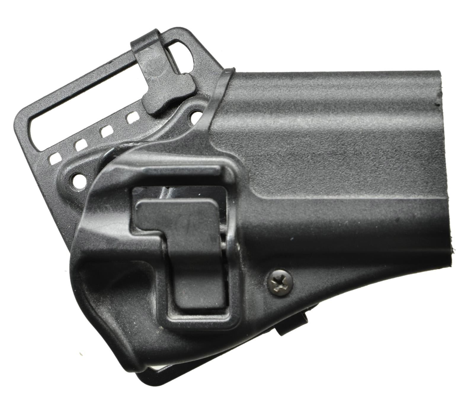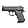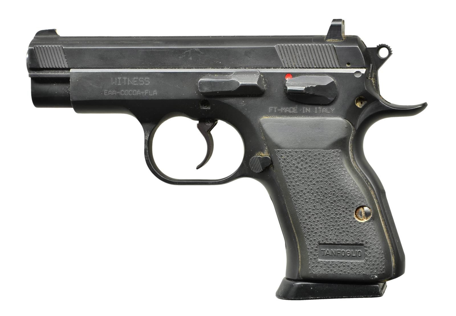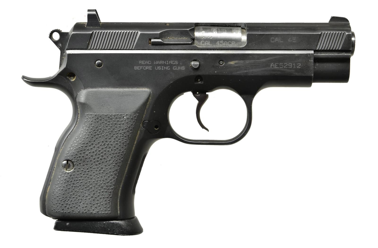 Cal. 45 ACP. S# AE52912. Bbl. 3.75". Matte black finish. Traditional double action. Left side controls. Full length guide rod. Front & rear serrated slide w/ serrated flat top rib. 3 Dot sights. Serrated hammer spur, thumb safety slide release & mag. release. Black 2 pc. rubber grips. Serrated front & rear strap. MAGS: 1 steel 8 rd. UNATTACHED ACCESSORIES: Blackhawk CQC holster. CONDITION: finish is complete w/ thinning on high spots & in areas of mechanical intervention. Bright bore w/ strong rifling. Fire control mechanism appears to function correctly when cycled by hand. (22-3453/JZ). MODERN. $400-600.