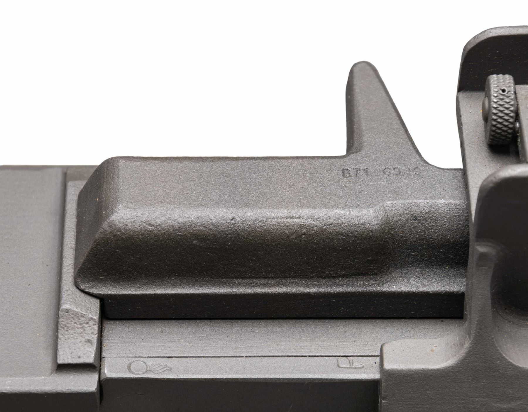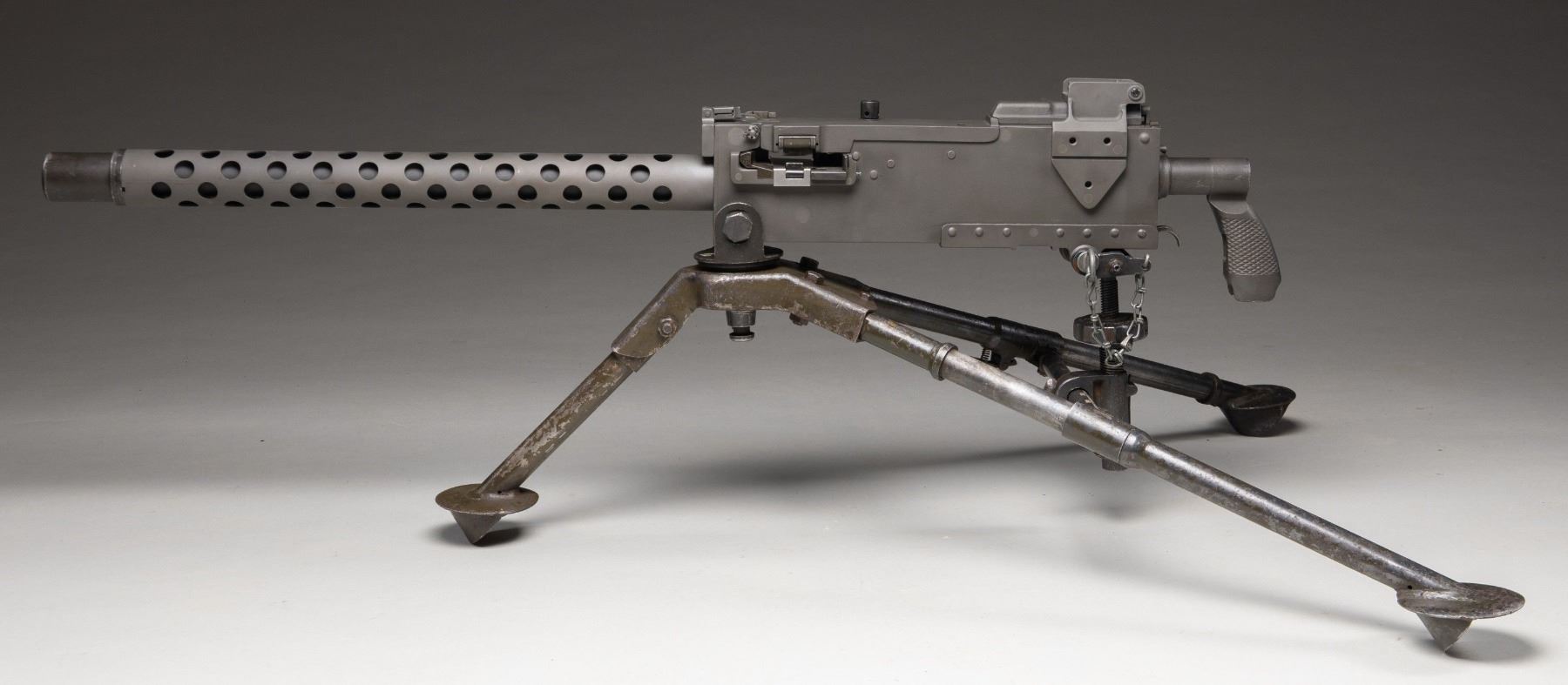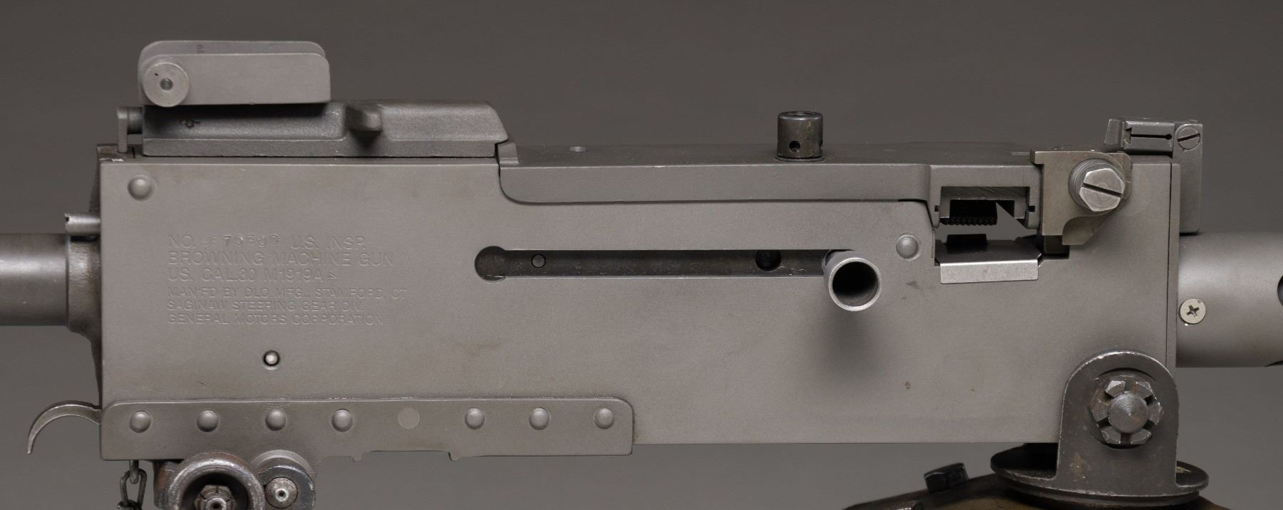TRIPOD WITH LINKING MACHINE. Cal. 30. S# 8670300. Bbl. 24". Mfg. by RAMO. The 1919 is one of the most iconic ground & vehicle mounted machine guns in U.S. Military history w/ such a long range of service, from the early 1920's through Vietnam, video footage as well as Hollywood films have featured this weapon system in countless reels. Originally it was intended to be the "go-to" Browning design tank gun in WWI, though it was introduced a little too late. It utilizes a heavier bbl. than its water cooled predecessor & traded the massive water jacket for a much slimmer slotted bbl. shroud for air cooling. The 1919A4 is one of the most commonly encountered & was originally issued in both a fixed & flexible platform. The fixed gun was often used on WW2 vehicles, while the flexible had a focus as an infantry company level machine gun. Numerous mounting options were available, including several tripod variants, pedestal mounts & even an A6 variation, which utilized a bipod & shoulder stock, w/ the intention of making it more user friendly. Today, these guns are highly sought after by recreational shooters & reenactors. They saw such a long period of service that spare parts are fairly readily available. This specific offering is assembled on a DLO sideplate. Currently configured in 308. Black parkerized finish on all exposed surfaces. Flip up blade style front sight & flip up rear sight w/ adj. peep for windage & elevation up to 2400 yds. Mounted on a low profile M2 military tripod w/ T&E mechanism. It has an insert for running steel links as well as cloth belts. Right sideplate marked: "NO. 8670300 U.S. INSP. / BROWNING MACHINE GUN / US. CAL.30 M1919A4 / MAN'FD BY DLO MFG., STAMFORD, CT / SAGINAW STEERING GEAR DIV / GENERAL MOTORS CORPORATION". UNATTACHED ACCESSORIES: M2 tripod w/ pintle & T&E mechanism, new linker, 1# of israeli links, 3 cloth belts & 1917/ 1919 combination wrench. CONDITION: Finish complete & consistent w/ only light sign or prior use. Tripod moves fluidly & T&E mechanism functions smoothly. Bore is bright w/ strong rifling. Fire control mechanism appears to function correctly when cycled by hand. NATIONAL FIREARMS ACT MG REQUIRING BATF TRANSFER BEFORE TAKING POSSESSION. FULLY TRANSFERABLE. (03-1890/JZ). MODERN CLASS III. $17,000-25,000.