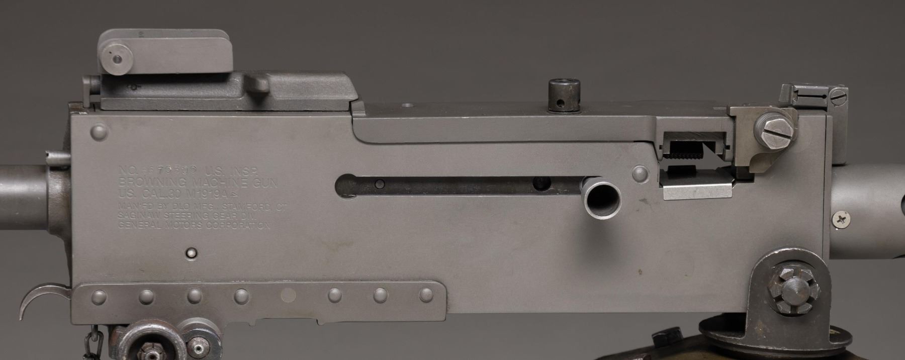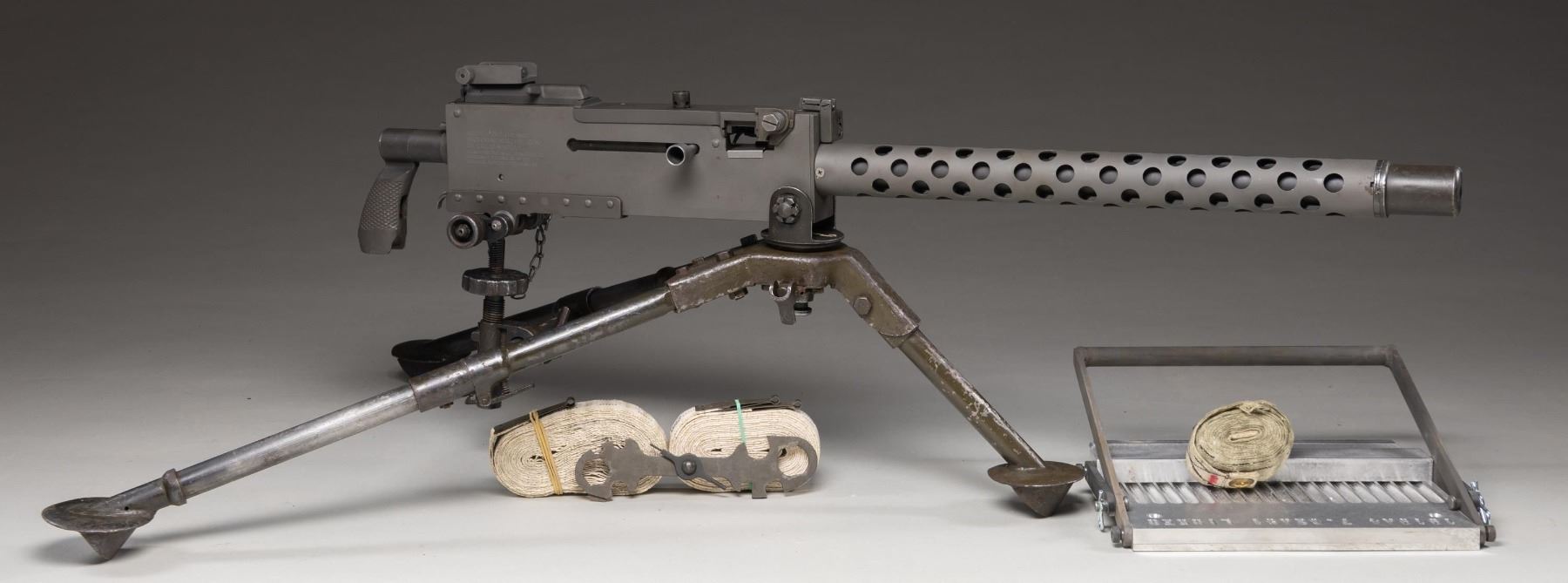 WITH LINKING MACHINE. Cal. 30. S# 8670300. Bbl. 24". The 1919 is one of the most iconic ground & vehicle mounted machine guns in U.S. Military history w/ such a long range of service, from the early 1920's through Vietnam, video footage as well as Hollywood films have featured this weapon system in countless reels. Originally it was intended to be the "go-to" Browning design tank gun in WWI, though it was introduced a little too late. It utilizes a heavier bbl. than its water cooled predecessor & traded the massive water jacket for a much slimmer slotted bbl. shroud for air cooling. The 1919A4 is one of the most commonly encountered & was originally issued in both a fixed & flexible platform. The fixed gun was often used on WW2 vehicles, while the flexible had a focus as an infantry company level machine gun. Numerous mounting options were available, including several tripod variants, pedestal mounts & even an A6 variation, which utilized a bipod & shoulder stock, w/ the intention of making it more user friendly. Today, these guns are highly sought after by recreational shooters & reenactors. They saw such a long period of service that spare parts are fairly readily available. This specific offering is assembled on a DLO sideplate. Currently configured in 308. Black parkerized finish on all exposed surfaces. Flip up blade style front sight & flip up rear sight w/ adj. peep for windage & elevation up to 2400 yds. Mounted on a low profile M2 military tripod w/ T&E mechanism. It has an insert for running steel links as well as cloth belts. Right sideplate marked: "NO. 8670300 U.S. INSP. / BROWNING MACHINE GUN / US. CAL.30 M1919A4 / MAN'FD BY DLO MFG., STAMFORD, CT / SAGINAW STEERING GEAR DIV / GENERAL MOTORS CORPORATION". UNATTACHED ACCESSORIES: M2 tripod w/ pintle & T&E mechanism, new linker, 1# of israeli links, 3 cloth belts & 1917/ 1919 combination wrench. CONDITION: Recently refurbished & refinished by Ohio Ordnance Works, including rivet replacement & top cover rebuild before being headspaced, timed & test fired. Finish complete & consistent w/ only light sign of prior use. Tripod moves fluidly & T&E mechanism functions smoothly. Bore is bright w/ strong rifling. Fire control mechanism appears to function correctly when cycled by hand. NATIONAL FIREARMS ACT MG REQUIRING BATF TRANSFER BEFORE TAKING POSSESSION. FULLY TRANSFERABLE. (03-1944/JZ). MODERN CLASS III. $15,000-25,000.