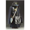 OF UNION INFANTRYMAN. This mannequin and uniform came from office of late Michael MacAfee, Curator of History, West Point Museum. This was his gear: Hardee hat, size 7 ¼, 9-button frock, belt with US buckle, cartridge box (SNY box plate) with over-the-shoulder strap with eagle plate, cap box, blue wool covered canteen with canvas strap, and tarred haversack & strap. Complete with mannequin. CONDITION: fine overall. (02-17025/JS). $600-800