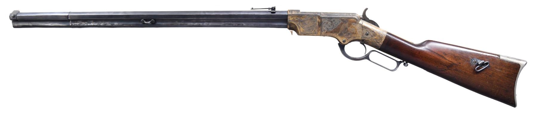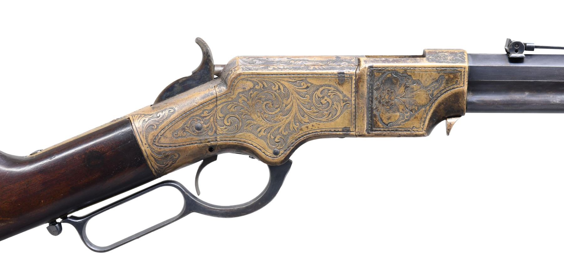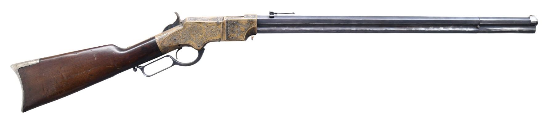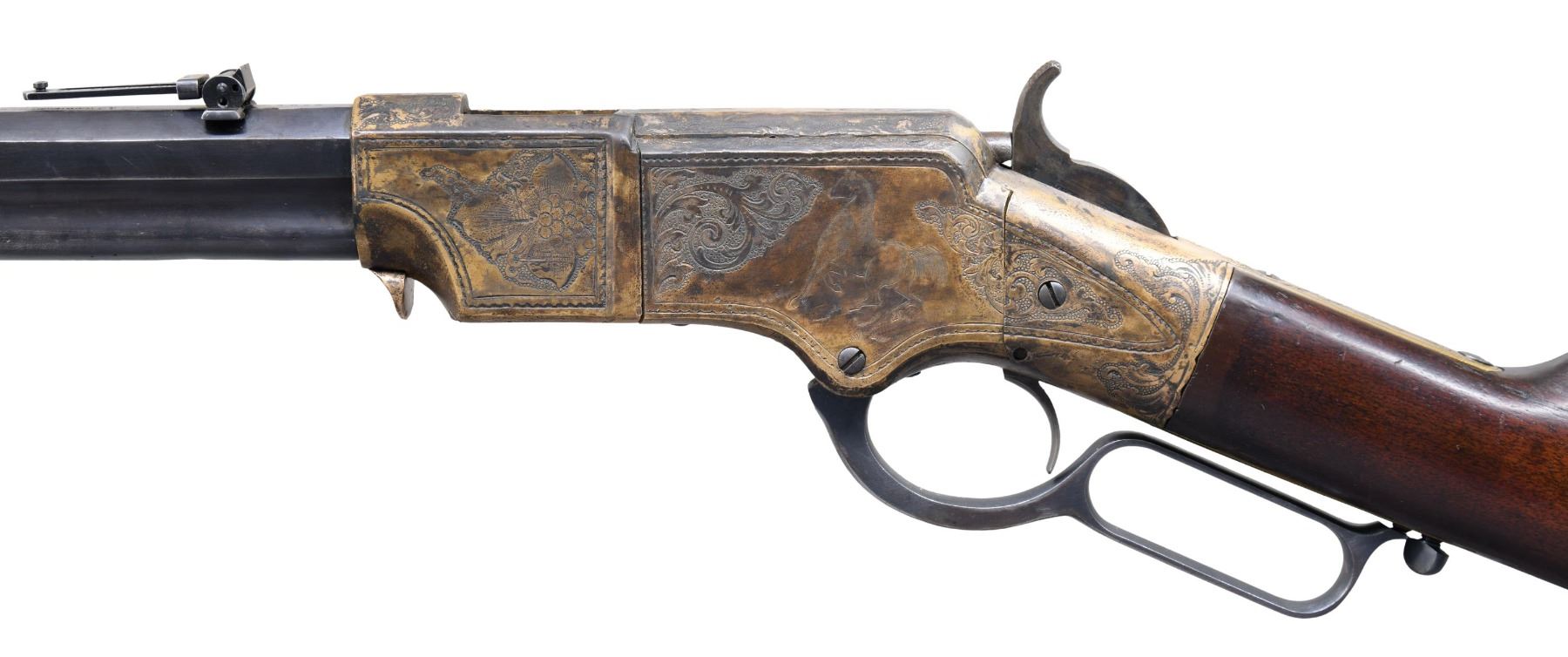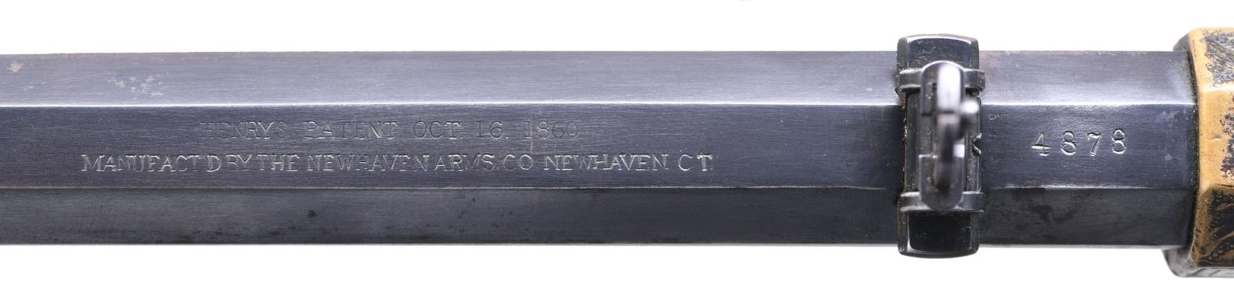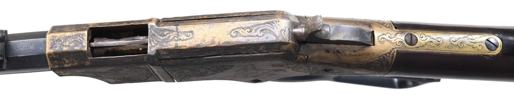 Cal. 44. S# 4878. This gun has 2 original serial numbers, "4878" on barrel, and "9178" on original engraved buttplate that has been silver plated at a later date. The frame has added number not original to manufacture "4878" with the original number possibly removed. The stock appears original and definitely has some age but no discernible serial number and there is old chipping in that channel where number would be stamped. The engraving is most likely modern emulating standard Henry designs with a horse engraved on the left side. CONDITION: good to very good as restored, barrel has been buffed and reblued, the assembly numbers on the sliding sleeve and round part of barrel are partially discernible, the muzzle collar appears replaced and the rear sight is a reproduction, old crack repair below comb in wrist. Mechanics functional, cartridge follower binds at frame. Bore is heavily pitted and no discernible rifling. (01-26377/JS). ANTIQUE. $3,000-6,000.