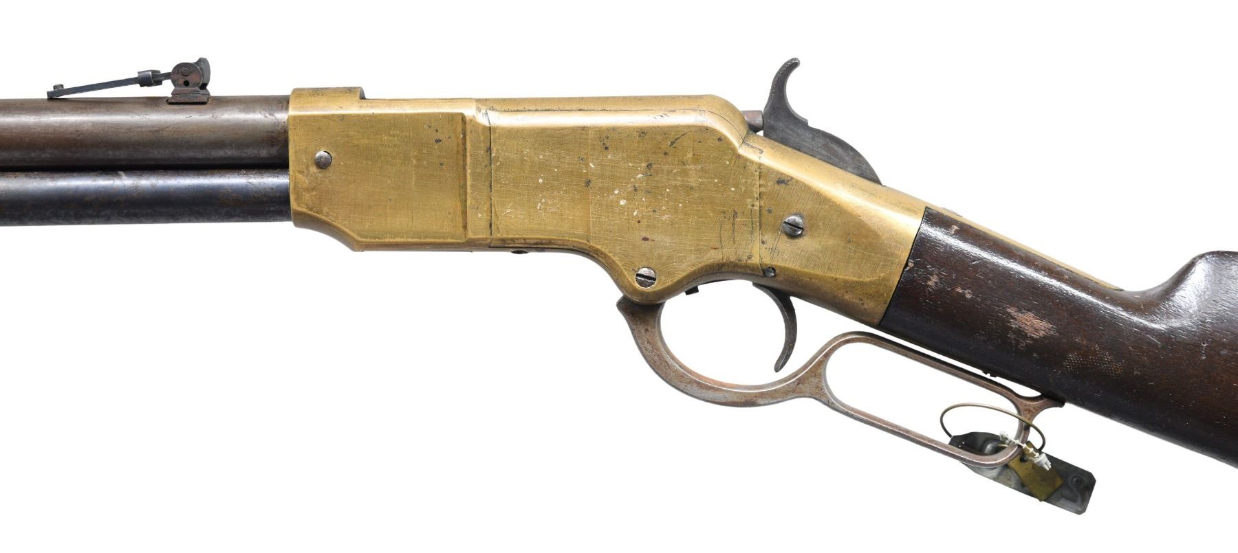Cal. 44. S# 3201. Assembled gun with 26" round barrel with fake Henry markings, Briggs style magazine tube which loads from slot near frame Covered by sliding sleeve. The frame is not marked and has a round top like found on early 1866 Winchesters. The butt stock, buttplate, and buttplate screws our original and each numbered correctly "3201". If you have an early martial Henry, with replaced butt, this would be worth buying with correctly numbered stock, butt plate and perfectly timed screws.CONDITION: good to very good as configured, rear sling swivel, rear sight are reproductions. As noted serial number on barrel and Henry patent marking are modern. Stock is sound, refinished and varnished. Mechanics are fine, discernible thin rifling and bore. (25-1681/JS). MODERN. $600-800.