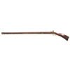 Cal. 50. NSN. Bbl. antique vintage 40" octagon w/ deeply cut rifling. Brass blade front sight w/ fixed V notch rear sight. Modern trade lock stamped “G. MOYER LANCASTER PA”. Double set triggers. Modern custom made full length Roman rose cheekpiece stock of curly maple. Cheekpiece wrist at tang areas have extensive fine relief carving. Right side has rectangular lid pierced segmented & engraved patchbox. Other brass fittings consist of crescent buttplate, toeplate, finger curl trigger guard, sideplate, 3 sets of ornate wedge escutcheons, nose cap, thimble & 2 faceted pipes. German silver fittings are an eight point star on cheekpiece & an oval wrist plate. Artificially striped hardwood ramrod. CONDITION: antique bbl. has aged patina appearance w/ scattered heavy pitting. Dark pitted bore retaining deep rifling. Lock has modern browned finish. Patchbox is starting to acquire a pleasing dark patina. Stock has good finish showing scattered marks. Functioning lock. Triggers must be set to fire. (01-21721/DS). ANTIQUE. $750-1,500.