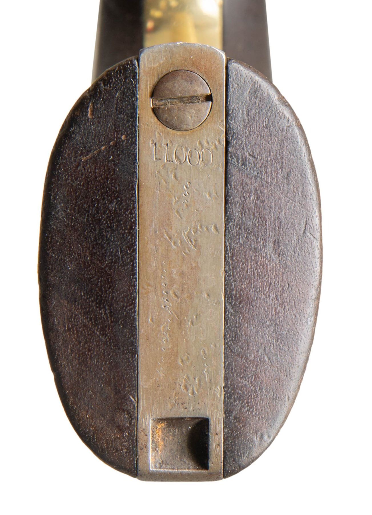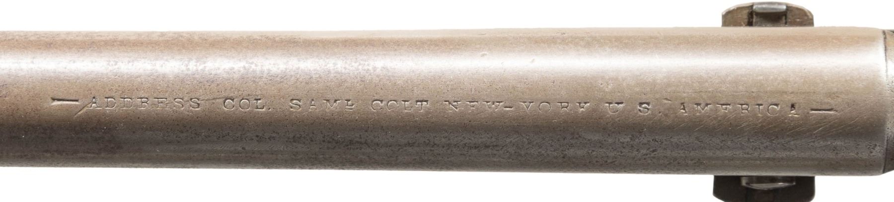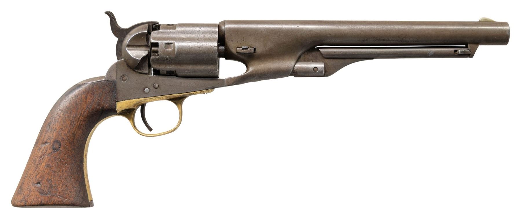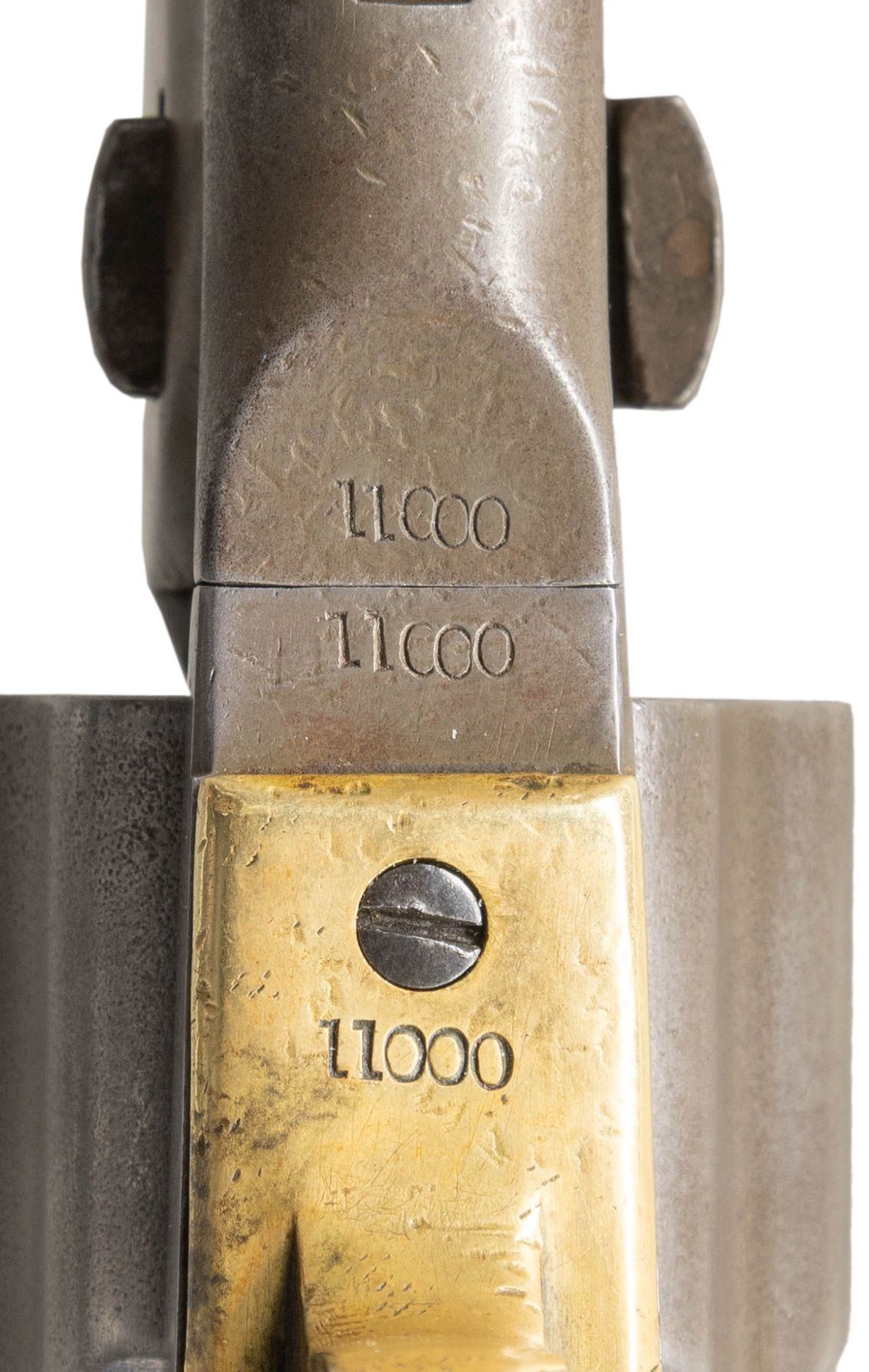 Cal. .44. S# 11000. Standard configuration of 1863-1864 manufactured Civil War martial army revolver utilizing earlier fluted cylinder, 8" barrel with New York address, originally blued, brass trigger guard, one piece walnut grips with two inspector cartouches "WHR" on left & "JT" on right (William H. Russell & John Taylor). Sub-inspection initials A, B, C, D, and GG found on various parts. CONDITION: good to very good overall, all parts are original Colt, matching S# 11000 is restamped on barrel, frame, trigger guard, restamped "1000" is stamped on back of cylinder, "000" on wedge and cylinder pin. An original last 4 digits of S# "0005" inked on back strap channel. Artificial aged gray patina, discernible markings, good well-fit grips with 2 good readable cartouches, mechanics are fine, good rifled bore. PROVENANCE: Bob Allispones estate collection. (02-28675/JS). ANTIQUE. $1,000-3,000.