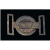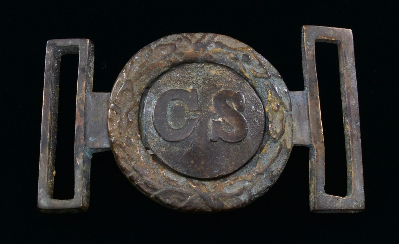 CONFEDERATE 2 PIECE SWORD BELT BUCKLE. 83.8mm wide, wreath 48.3mm, keeper 50.8mm, tongue keeper 47.7mm. Filled keepers and roman numeral "III" cast in back of wreath. CONDITION: very good, mottled brass patina, still retains good "body curve". (02-17390/JS). $1,500-2,000.